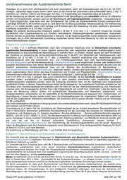 Verfahrenshinweise der Ausländerbehörde Berlin VAB B.BeschV.2. - 9. Zuwanderung von Fachkräften Inhaltsverzeichnis B.BeschV.2. - 9. Zuwanderung von Fachkräften .......................................................................................... 579 Änderungsdatum ................................................................................................................................... 585 B.BeschV.2. Hochqualifizierte, Blaue Karte, Fachkräfte mit inländischen Hochschulabschluss ........... 579 2.1.1 NE für Hochqualifizierte ......................................................................................................... 579 2.1.2 Blaue Karte ohne Zustimmungserfordernis .......................................................................... 579 2.1.3 Fachkräfte mit inländischem Hochschulabschluss ............................................................... 579 2.2 Blaue Karte EU mit Zustimmung .............................................................................................. 580 2.3 Sonstige Hochschulabsolventen .............................................................................................. 580 2.4 Entgeltgrenze Blaue Karte EU ................................................................................................. 580 B.BeschV.3. Führungskräfte .................................................................................................................. 580 B.BeschV.4. Leitende Angestellte und Spezialisten .............................................................................. 581 B.BeschV.5. Wissenschaft, Forschung und Entwicklung ...................................................................... 581 B.BeschV.6. Ausbildungsberufe ............................................................................................................ 582 B.BeschV.7. Absolventinnen und Absolventen deutscher Auslandsschulen ........................................ 582 B.BeschV.8. Betriebliche Aus- und Weiterbildung; Anerkennung ausländischer Berufsqualifikationen ...... 583 B.BeschV.9. Beschäftigung bei Vorbeschäftigungszeiten oder längerem Voraufenthalt ...................... 583 B.BeschV.2. - 9. Zuwanderung von Fachkräften Änderungsdatum (16.01.2017; 24.07.2017; RiLiUmsG 2017 ) B.BeschV.2. Hochqualifizierte, Blaue Karte, Fachkräfte mit inländischen Hochschulabschluss 2.1.1 NE für Hochqualifizierte Keiner Zustimmung bedarf die Zustimmung zur NE nach § 19 AufenthG, s. VAB.A.19.1.1. 2.1.2 Blaue Karte ohne Zustimmungserfordernis Die Erteilung einer Blauen Karte ist zustimmungsfrei unter den in den VAB.A.19a.1.2 geregelten Voraussetzungen. Liegen die Voraussetzungen einer zustimmungsfreien Erteilung nicht vor, kommt bei Beschäftigung in einem Mangelberuf und Vorliegen eines ausländischen Hochschulabschlusses die Zustimmung gemäß § 2 Abs. 2 BeschV in Betracht, vgl. VAB.B.BeschV 2.2.. 2.1.3 Fachkräfte mit inländischem Hochschulabschluss Keiner Zustimmung bedarf die Beschäftigung eines ausländischen Absolventen deutscher Hochschulen , wenn eine der beruflichen Qualifikation angemessene Beschäftigung beabsichtigt ist (zum Begriff der angemessenen Beschäftigung vgl. die Ausführungen unter A.16.4.2.). Von der Zustimmungsfreiheit sind auch ausländische Lehramts- und Rechtsreferendare für die – in der Regel – zweijährige Dauer des Referendariats erfasst, sofern sie über einen entsprechenden inländischen Hochschulabschluss verfügen. Rechtsgrundlage für die AE ist hier § 17 Abs. 1 AufenthG. Ein Zweckwechsel von § 16 Abs. 1 AufenthG zu § 17 Abs. 1 AufenthG ist vor dem Hintergrund des § 16 Abs. 2 AufenthG zulässig, weil es sich bei dem Referendariat um eine für einen Lehramtsanwärter mit entsprechendem Bachelor- bzw. Master-Abschluss bzw. Juristen mit 1. juristischen Staatsexamen angemessene Beschäftigung im Sinne des § 16 Abs. 4 AufenthG handelt. So ist zwar die Vergütung eher gering, die Beschäftigung als Referendar ist aber für Lehramtsanwärter / Juristen üblich. Dementsprechend findet auch § 16 Abs. 4 AufenthG zur Suche eines Referendariatsplatzes Anwendung, wenn die übrigen Voraussetzungen für die Erteilung dieser Aufenthaltserlaubnis vorliegen. Nach Beendigung des Referendariats gilt § 17 Abs. 3. IT-Fachkräfte, die über keinen Hochschulabschluss verfügen, haben bei entsprechendem Bedarf an Arbeitskräften die Möglichkeit nach der neuen Regelung in § 6 Abs. 2 Satz 1 Nr. 2 BeschV (neu) einen Zugang zum Arbeitsmarkt zu erhalten. Für die zustimmungsfreie Erteilung einer Aufenthaltserlaubnis zur Beschäftigung bzw. die Zustimmung für ein entsprechendes Visum ist grundsätzlich die Vorlage eines Arbeitsvertrages erforderlich. So der gesicherte Lebensunterhalt nachgewiesen ist oder anderweitig nachgewiesen werden kann, genügt allerdings auch die Vorlage einer Einstellungszusicherung. Ist zweifelhaft, ob es sich bei der angestrebten Erwerbstätigkeit, um eine Beschäftigung oder eine selbständige Tätigkeit handelt, können die Beteiligten (Vertragspartner) aufgefordert werden, eine Statusfeststellung bei der Deutschen Rentenversicherung durchzuführen. Dies kann etwa bei Vorlage eines Honorar-/ Arbeitsvertrages eines wissenschaftlichen Mitarbeiters mit einem Professor/Dozenten einer Hochschule der Fall sein (zu den Einzelheiten vgl. VAB.A.21.0.). Dieses PDF wurde erstellt am: 01.08.2017 Seite 579 von 786