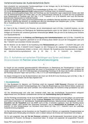 Verfahrenshinweise der Ausländerbehörde Berlin grds. zentral über das Grenzdurchgangslager Friedland (Niedersächsisches Zentrum für Integration) oder Bramsche für die Dauer von 14 Tagen erstaufzunehmen und von dort aus vom BAMF zu verteilen. Ausgenommen sind unbegleitete Minderjährige und Schwerstkranke. 1.6. Personen, die eigenständig einreisen, werden vom BAMF auf der Grundlage des Königsteiner Schlüssels (s. auch nachfolgend 1.8.) bei der Verteilentscheidung berücksichtigt. Die Aufnahmezusage und die Ausnahme von der Passpflicht sind bei eigenständig einreisenden Personen ab Bekanntgabe drei Monate gültig und erlöschen, wenn in diesem Zeitraum die Einreise nach Deutschland nicht erfolgt ist. 1.7. Personen, die schwerstkrank oder minderjährig sind und ohne Familienangehörige aufgenommen werden, werden zwar in die Verteilung einbezogen; in solchen Fällen klärt das BAMF vor der Einreise unter Berücksichtigung der jew. Anzahl bereits erfolgter Aufnahmen, welches Land zur Aufnahme einer schwerstkranken Person und ihrer Familienangehörigen bzw. eines unbegleiteten Minderjährigen in der Lage ist. Die Personen werden von einem Vertreter des aufnehmenden Landes unmittelbar nach Ankunft vom Zielflughafen zum Zielort begleitet. Unbegleitete Minderjährige werden anschließend durch das zuständige Jugendamt am Zielort in Obhut genommen. 1.8. Die Verteilung der ausgewählten Personen erfolgt nach Maßgabe des Königsteiner Schlüssels (Berlin 5,07 % für 2013) und unter Berücksichtigung familiärer und sonstiger Bindungen nach Deutschland (s. dazu auch nachfolgend 2.). § 24 Abs. 3 bis 5 AufenthG findet Anwendung, d.h. u.a., dass aufgenommene Flüchtlinge keinen Anspruch darauf haben, sich an einem bestimmten Ort aufzuhalten, ein Widerspruch gegen die Zuweisungsentscheidung nicht stattfindet und eine Klage keine aufschiebende Wirkung hat. 2. Begünstigter Personenkreis Die Auswahl der Flüchtlinge durch das BAMF orientiert sich an: a) Humanitären Kriterien Besonders schutzbedürftige Kinder mit ihren Eltern bzw. Personensorgeberechtigten unter Wahrung der Familieneinheit, medizinischer Bedarf; hier liegt die Obergrenze bei 3 %, Frauen in prekären Lebenssituationen, Angehörige religiöser Minderheiten, sofern eine spezifische religionsbezogene Verfolgungssituation vorliegt. Voraussetzung für eine Aufnahme nach humanitären Kriterien ist eine bis zum 31.03.2013 erfolgte Registrierung beim UNHCR oder Caritas im Libanon. b ) Bezügen zu Deutschland wie Familiäre Bindungen, Voraufenthalte, Sprachkenntnisse, sonstige Bindungen nach Deutschland, insbesondere aufnahmebereite Institutionen syrischer religiöser Minderheiten. Dabei sollen vorrangig Personen berücksichtigt werden, für die Verpflichtungserklärungen abgegeben wurden oder die Bereitschaft erklärt wurde, bei ihrer Unterbringung und Lebensunterhaltssicherung einen Beitrag zu leisten. c) Fähigkeit, nach Konfliktende einen besonderen Beitrag zum Wiederaufbau des Landes zu leisten, etwa durch die Möglichkeit, vorhandene Qualifikationen während des Aufenthalts in Deutschland zu erhalten und auszubauen, wenn diese Mglichkeit am Fluchtort nicht besteht. Die Aufnahme setzt nicht die Erfüllung mehrerer Kriterien voraus. 3. Ausschlussgründe Ausgeschlossen sind grundsätzlich Personen, die wegen Delikten, die in Deutschland als vorsätzliche Straftat anzusehen sind, verurteilt worden sind oder bei denen tatsächliche Anhaltspunkte die Schlussfolgerung rechtfertigen, dass Verbindungen zu kriminellen Organisationen oder terroristischen Vereinigungen bestehen oder bestanden haben oder dass sie in sonstiger Weise Bestrebungen verfolgen oder unterstützen oder unterstützt haben, die gegen den Gedanken der Völkerverständigung verstoßen oder gegen das friedliche Zusammenleben der Völker gerichtet sind. 4. Erteilung und Verlängerung des Aufenthaltstitels im Inland 4.1. Im Rahmen des Aufnahmeverfahrens findet eine Überprüfung der Personen im Visumverfahren durch die Sicherheitsbehörden statt. Eine Beteiligung der Sicherheitsbehörden im Inland ist damit erst vor der Verlängerung der Dieses PDF wurde erstellt am: 01.08.2018 Seite 217 von 811