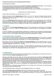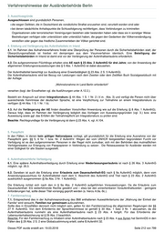 Verfahrenshinweise der Ausländerbehörde Berlin zum Familiennachzug berechtigt (vgl. etwa die Fallkonstellationen des § 29 Abs. 3 S. 3 bzw. § 104 Abs. 13) sowie solche nachzugswilligen Familienangehörigen, die nicht die Erteilungsvoraussetzungen des §§ 27ff. erfüllen. Begünstigt sind Ehegatten, gleichgeschlechtliche, eingetragene Lebenspartner, Verwandte ersten Grades (Eltern, Kinder), Verwandte zweiten Grades (Großeltern, Enkel oder Geschwister) sowie deren Ehegatten und minderjährige Kinder. Weitere Personensorgeberechtigte begünstigter minderjähriger Kinder können (unter Wahrung der Einheit der Familie) mit einbezogen werden. 2.3. Allgemeine Erteilungsvoraussetzungen 2.3.1. Grundsätzlich gelten die allgemeinen Erteilungsvoraussetzungen des § 5, deren Vorliegen bereits im Visumverfahren nachzuweisen und zu prüfen ist. 2.3.2. Bzgl. des gesicherten Lebensunterhalts gem. § 5 Abs. 1 Nr. 1 setzt die Zustimmung zur Visumserteilung bzw. zur erstmaligen Erteilung der Aufenthaltserlaubnis voraus, dass eine Verpflichtungserklärung nach § 68 durch den Familienangehörigen abgegeben wurde (zum Begriff des Dritten vgl. A.2.3.1.13. ) . Dabei ist die Verpflichtung für die Versorgung im Krankheitsfall und bei Pflegebedürftigkeit auszunehmen und dies auf dem Vordruck unter Bemerkungen aufzunehmen. Daraus ergeben sich allerdings keine Abschläge bei der Höhe und Dauerhaftigkeit der Einkünfte des Verpflichtungsgebers im Rahmen der Bonitätsprüfung. (Behördenvermerk: Aufnahmeanordnung Syrien vom 04.12.2017 gem. § 23 Abs,1 AufenthG. Verpflichtung nach § 68 AufenthG ausgenommen Versorgung im Krankheitsfall und bei Pflegebedürftigkeit). Die Verpflichtungserklärung, die für jede einreisewillige Person getrennt abzugeben ist, ist sodann mit der Vorabzustimmung an die zuständige deutsche Auslandsvertretung zu übersenden. Bei der Abgabe der Verpflichtungserklärung sind abweichend vom üblichen Verfahren für die Berechnung ausreichenden Lebensunterhaltes neben den Sätzen der AV Wohnen die Sätze nach dem AsylbLG zu Grunde zu legen. 2.3.3. Ausnahmen von der Passpflicht gem. § 5 Abs. 1 Nr. 4 können nach § 3 Abs. 2 durch das Bundesamt für Migration und Flüchtlinge zugelassen werden, sofern der im Regelfall bei der deutschen Auslandsvertretung vorgelegte Reisepass der einreisewilligen Person nicht anerkannt wird, die Identität der einreisewilligen Person aber durch andere Dokumente (z.B. Identitätskarte, Staatsangehörigkeitsnachweis, Geburtsurkunde) nachgewiesen wird. Kann kein gültiger Reisepass vorgelegt werden, die Identität aber anderweitig nachgewiesen werden, kann ein Reiseausweis für Ausländer nach den Voraussetzungen der §§ 5 und 7 AufenthV durch die zuständige deutsche Auslandsvertretung ausgestellt werden. Kopien von uns im Rahmen der Prüfung einer Vorabzustimmung vorgelegte Dokumente sind mit der Vorabzustimmung an die zuständige deutsche Auslandsvertretung zu übersenden. 2.3.4. Bzgl. der Erteilungsvoraussetzungen des § 5 Abs. 1 Nr. 2 bzw. Abs. 4 gelten keine Besonderheiten. Von der Aufnahmeanordnung wurden allerdings ausdrücklich Personen ausgeschlossen, die wegen Delikten, die in Deutschland als vorsätzliche Straftat anzusehen sind, verurteilt worden sind oder bei denen tatsächliche Anhaltspunkte die Schlussfolgerung rechtfertigen, dass Verbindungen zu kriminellen Organisationen oder terroristischen Vereinigungen bestehen oder dass sie in sonstiger Weise Bestrebungen verfolgen oder unterstützen oder unterstützt haben, die gegen die Gedanken der Völkerverständigung verstoßen oder gegen das friedliche Zusammenleben der Völker gerichtet sind. Merke: Unabhängig von der Möglichkeit der Zustimmung zur Erteilung eines Visums oder zur Erteilung einer Aufenthaltserlaubnis auf der Basis des § 23 Abs. 1 ist immer auch zu prüfen, ob nach den sonstigen Vorschriften des Aufenthaltsgesetzes insb. §§ 27 ff. ein Titel erteilt werden kann oder die Möglichkeit eines Aufnahmevorschlages nach A.23.s.5. besteht. Im Fall einer beabsichtigten Titelerteilung sollte gleichfalls von § 31 Abs. 3 AufenthV Gebrauch gemacht werden. 3. Erteilung und Verlängerung des Aufenthaltstitels im Inland 3.1. Im Rahmen des Visumsverfahrens findet eine Überprüfung der Personen durch die Sicherheitsbehörden statt. Eine Beteiligung der Sicherheitsbehörden im Inland ist damit erst vor der Verlängerung der Aufenthaltserlaubnis erforderlich. 3.2. Die aufgenommenen Personen erhalten eine Aufenthaltserlaubnis für zwei Jahre; bzgl. der allgemeinen Erteilungsvoraussetzungen gelten für die Ersterteilung die o.g. Ausführungen entsprechend. Die Aufenthaltserlaubnis ist mit der Nebenbestimmung „Erwerbstätigkeit gestattet“ sowie dem leistungsrechtlich relevanten Hinweis "Aufnahme wegen des Krieges im Heimatland" zu versehen. Die Aufenthaltserlaubnis wird bei erstmaliger Erteilung gem. § 12a Abs. 1 S. 1 mit dem Hinweis „Wohnsitznahme im Land Berlin erforderlich" Dieses PDF wurde erstellt am: 19.03.2018 Seite 218 von 799