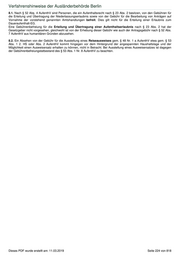 Verfahrenshinweise der Ausländerbehörde Berlin 1.2. Die Aufnahmezusage wird unter dem Vorbehalt erteilt, dass das anschließende Visumverfahren erfolgreich abgeschlossen wird. Die obersten Landesbehörden stimmen der Visumerteilung nach § 32 AufenthV zu . 1.3. Die Flüchtlinge sind berechtigt, mit der durch das BAMF erteilten Aufnahmezusage und einem gültigen und anerkannten Reisepass nach Deutschland einzureisen. Ist der vorgelegte Reisepass nicht anerkannt oder ungültig, die Identität des Flüchtlings aber durch andere Dokumente (z.B. Identitätskarte, Staatsangehörigkeitsnachweis, Geburtsurkunde) unter Berücksichtigung einer plausiblen Dokumentenlegende nachgewiesen, wird eine Ausnahme von der Passpflicht durch das BAMF nach § 3 Abs. 2 zugelassen. Kann der Flüchtling keinen Reisepass vorlegen, seine Identität aber anderweitig nachweisen, wird ein Reiseausweis für Ausländer nach §§ 5, 7 AufenthV durch die zuständige Botschaft bzw. das zuständige Generalkonsulat in der Türkei mit einer Gültigkeitsdauer von höchstens drei Monaten (§ 8 Abs. 2 S. 1 AufenthV) ausgestellt, sofern nachweislich kein anderes der Identifizierung dienendes Passersatzdokument erlangt werden kann. In diesen Fällen ist in der im Reiseausweis enthaltenen Rubrik, auf welchen Unterlagen der Reiseausweis ausgestellt wird, der Vermerk anzubringen, dass die Personalien auf eigenen Angaben des Schutzbedürftigen beruhen. Dabei bittet das Bundesministerium des Innern bei Antragstellern aus den vom sogenannten Islamischen Staat kontrollierten Gebieten Syriens, des Irak und Libyens ( Syrien: Städte Dair al Zur, ar-Raqqa, Idlib, Gouvernement Idlib, Gouvernement Al Hasakah, Irak: Provinz Al-Anbar, Stadt Mossul, Libyen: Stadt Sirte) um besonders sorgfältige Prüfung. 1.4. Die Aufnahmezusage und die Ausnahme von der Passpflicht sind ab Bekanntgabe sechs Monate gültig und erlöschen, wenn in diesem Zeitraum die Einreise nach Deutschland nicht erfolgt ist. 1 .5. Es wird angestrebt, die Erstaufnahme der ausgewählten Personen mit Ausnahme unbegleiteter Minderjähriger und Schwerstkranker zentral über die Landesaufnahmebehörde Niedersachsen, vorrangig am Standort Grenzdurchgangslager Friedland, für die Dauer von 14 Tagen durchzugführen und von dort aus vom BAMF zu verteilen. Soweit eine Aufnahme aus Kapazitätsgründen nicht möglich ist und eine zentrale Unterbringung nicht gewährleistet werden kann, erklären sich die Länder bereit, die von ihnen aufzunehmenden Flüchtlinge unmittelbar nach deren Einreise vom Flughafen abzuholen und aufzunehmen (LAF). Niedersachsen sowie das BAMF informieren die Länder rechtzeitig, spätestens 21 Tage vor der Einreise der Flüchtlinge. Ausgenommen sind unbegleitete Minderjährige und Schwerstkranke. 1.6. Personen, die schwerstkrank oder minderjährig sind und ohne Familienangehörige aufgenommen werden, werden zwar in die Verteilung einbezogen; in solchen Fällen klärt das BAMF vor der Einreise unter Berücksichtigung der jew. Anzahl bereits erfolgter Aufnahmen, welches Land zur Aufnahme einer schwerstkranken Person und ihrer Familienangehörigen bzw. eines unbegleiteten Minderjährigen bereit ist. Die Personen werden von einem Vertreter des aufnehmenden Landes unmittelbar nach Ankunft vom Zielflughafen zum Zielort begleitet. Bei Minderjährigen, die ohne Familienangehörige aufgenommen werden, gewährleistet das aufnehmende Land, dass diese am Zielflughafen in Empfang genommen und dem für die Inobhutnahme zuständigen Jugendamt zugeführt werden. 1.7. Die Verteilung der ausgewählten Personen erfolgt nach Maßgabe des Königsteiner Schlüssels (Berlin 5,08 % für 2016, ab 06.11.2018 5,14% ) und unter Berücksichtigung der Wahrung der Familieneinheit und sonstiger integrationsförderlicher Bindungen nach Deutschland. Für die Verteilung finden § 24 Abs. 3 und 4 entsprechende Anwendung, bzgl. der Wohnsitzregelung gilt bis zum 05.08.2019 § 12a; danach finden § 24 Abs. 4 und 5 Anwendung (s. dazu auch nachfolgend 2.). 2. Begünstigter Personenkreis Die Auswahl der Flüchtlinge durch das BAMF orientiert sich an folgenden Kriterien: Wahrung der Familieneinheit Familiäre oder sonstige integrationsförderliche Bindungen nach Deutschland, Integrationsfähigkeit (Indikatoren: Grad der Schul- und berufsausbildung, Berufserfahrung, Sprachkenntnisse, Religionszugehörigkeit, geringes Alter), Grad der Schutzbedürftigkeit, ggf. weitere Kriterien, die im Rahmen von gemeinsamen Verfahrensleitlinien auf EU-Ebene mit der Türkei vereinbart werden. 3. Ausschlussgründe Im Rahmen des Aufnahmeverfahrens findet eine Überprüfung der Personen durch die Sicherheitsbehörden statt. Ausgeschlossen von der Aufnahme sind grundsätzlich Personen, die wegen Delikten, die in Deutschland als vorsätzliche Straftat anzusehen sind, verurteilt worden sind oder bei denen tatsächliche Anhaltspunkte die Schlussfolgerung rechtfertigen, dass Verbindungen zu kriminellen Organisationen oder terroristischen Vereinigungen bestehen oder bestanden haben oder dass sie in sonstiger Weise Bestrebungen verfolgen oder unterstützen oder unterstützt haben, die gegen den Gedanken der Völkerverständigung verstoßen oder gegen das friedliche Zusammenleben der Völker gerichtet sind. 4. Erteilung und Verlängerung des Aufenthaltstitels im Inland Dieses PDF wurde erstellt am: 11.03.2019 Seite 222 von 818