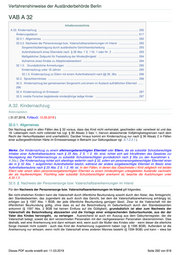 Verfahrenshinweise der Ausländerbehörde Berlin VAB A 32 Inhaltsverzeichnis A.32. Kindernachzug ................................................................................................................................ 292 Änderungsdatum ............................................................................................................................... 617 32.0.1. Allgemeines ........................................................................................................................... 292 32.0.2. Nachweis der Personensorge bzw. Vaterschaftsanerkennungen im Inland ......................... 292 Sorgerechtsübertragung durch ausländische Gerichtsentscheidung ......................................... 293 Aufenthaltsrecht eines Elternteils nach § 28 Abs. 1 S. 1 Nr. 1 oder Nr. 3 ................................. 293 Maßgeblicher Zeitpunkt für Feststellung der Minderjährigkeit .................................................... 294 Aufnahme eines Kindes zu Adoptionsbewerbern ....................................................................... 294 32.1.0. Grundsätzliche Anmerkungen ............................................................................................. 295 Kindernachzug unter 16 Jahren ................................................................................................. 295 32.1.3. Kindernachzug zu Eltern mit einem Aufenthaltsrecht nach §§ 36, 36a .......................... 296 32.2. Sprachkenntnisse .................................................................................................................... 296 32.3. KIndernachzug bei gemeinsamen Sorgerecht und einem im Ausland aufhältlichen Elternteil ...... 296 32.4. Kindernachzug im Ermessen .................................................................................................... 297 32.5. mobile Forscher begleitende minderjährige ledige Kinder ....................................................... 297 A.32. Kindernachzug Änderungsdatum ( 31.07.2018, FzNeuG; 13.09.2018 ) 32.0.1. Allgemeines Der Nachzug setzt in allen Fällen des § 32 voraus, dass das Kind nicht verheiratet, geschieden oder verwitwet ist und das 18. Lebensjahr noch nicht vollendet hat (vgl. § 80 Absatz 3 Satz 1; hiervon abweichende Volljährigkeitsgrenzen nach dem Recht der Herkunftsstaaten sind unerheblich). Darüber hinaus kommt ein Kindernachzug nur nach § 36 Absatz 2 in Fällen einer außergewöhnlichen Härte im Ermessenswege in Betracht (zur Geltungsdauer vgl. A.7.2.3.1.). Merke: Der Kindernachzug zu einem alleinsorgeberechtigten Elternteil oder Eltern, die als subsidiär Schutzberechtigte Inhaber einer Aufenthaltserlaubnis nach § 25 Abs. 2 S. 1 2. Alt. sind, richtet sich seit Inkrafttreten des Gesetzes zur Neuregelung des Familiennachzugs zu subsidiär Schutzberechtigten grundsätzlich nach § 36a (zu den Ausnahmen s. A.36a.). Der Kindernachzug richtet sich allerdings weiterhin nach § 32, sofern ein personensorgeberechtigter Elternteil einen der in § 32 Abs. 1 aufgeführten Aufenthaltstitel besitzt, während der andere sorgeberechtigte Elternteil im Besitz einer Aufenthaltserlaubnis nach § 25 Abs. 2 S. 1 2. Alt. ist. In den Fällen, in denen das (Geschwister-) Kind zeitgleich mit beiden Eltern oder einem allein personensorgeberechtigten Elternteil zu einem minderjährigen unbegleiteten Ausländer nachzieht, der als Asylberechtigter, Flüchtling oder subsidiär Schutzberechtigter anerkannt ist, beachte die Ausführungen unter A.32.1.3. 32.0. 2. Nachweis der Personensorge bzw. Vaterschaftsanerkennungen im Inland Für den Nachweis der Personensorge bzw. Vaterschaftsanerkennungen im Inland gilt folgendes: Bei nicht-ehelichen Kindern kann die Vaterschaft durch öffentliche Beurkundung sowohl durch den Notar, das Amtsgericht, den Standesbeamten, das Jugendamt als auch durch das Gericht, bei dem die Vaterschaftsanerkennung anhängig ist, erfolgen (so § 1597 Abs. 1 BGB, der jede öffentliche Beurkundung genügen lässt). Zwar ist die Vaterschaft mit der öffentlichen Beurkundung gültig, ohne dass es auf die Beischreibung im Geburtenbuch durch den Standesbeamten ankommt (§ 1597 Abs. 2 BGB hat keinen Einfluss auf die Gültigkeit), grundsätzlich ist aber zum Nachweis der Vaterschaft die Beischreibung abzuwarten und die Vorlage einer entsprechenden Geburtsurkunde, aus der der Vater des Kindes hervorgeht, zu verlangen . Ausreichend ist auch ein Auszug aus dem Geburtenregister, der die Vaterschaft belegt, soweit die dort verzeichneten Personalien mit den nachgewiesenen Personalien übereinstimmen. Dies deshalb, weil eine Anerkennung erst dann wirksam wird, wenn auch die Mutter des Kindes oder - wenn dieser die elterliche Sorge insoweit nicht zusteht - auch das Kind der Anerkennung zugestimmt haben (vgl. § 1595 BGB). Außerdem ist die Anerkennung nur wirksam, wenn nicht die Vaterschaft eines anderen Mannes besteht (§ 1594 BGB) und kann – etwa bei Dieses PDF wurde erstellt am: 11.03.2019 Seite 292 von 818