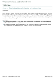 Verfahrenshinweise der Ausländerbehörde Berlin VAB E Iran 1 E.Iran.1. Entscheidung über Aufenthaltstitel bei iranischen StA (20.07.2005) Es ist darauf zu achten, dass bei der Entscheidung über Anträge iranischer Staatsangehöriger stets die Meistbegünstigungsklausel des Deutsch-Iranischen Niederlassungsabkommens - NAK - vom 17.02.1929 zu beachten ist. Danach ist bei Iranern das Ermessen "wohlwollend" auszuüben, d. h., das Interesse des Antragstellers im Rahmen der gesetzlichen Möglichkeiten angemessen zu berücksichtigen. In negativen Bescheiden ist bei iranischen Staatsangehörigen deshalb immer auf das NAK einzugehen. Ausnahmen: Die Meistbegünstigungsklausel ist auf die Iraner, die von vornherein einen auf unabsehbare Zeit angelegten Aufenthalt (z. B. zu Arbeitszwecken) anstreben, nicht anzuwenden. Bei Anträgen auf kurzfristige Visaverlängerung gem. § 6 Abs. 3 AufenthG ist das NAK nur zu berücksichtigen, wenn es sich ausnahmsweise nicht um Schengen-C-Visa, sondern um nationale Besuchsvisa handelt. Dieses PDF wurde erstellt am: 11.03.2019 Seite 754 von 818