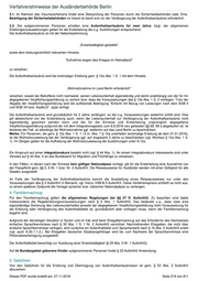 Verfahrenshinweise der Ausländerbehörde Berlin 3.1. Im Rahmen des Visumsverfahrens findet eine Überprüfung der Personen durch die Sicherheitsbehörden statt. Eine Beteiligung der Sicherheitsbehörden im Inland ist damit erst vor der Verlängerung der Aufenthaltserlaubnis erforderlich. 3.2. Die aufgenommenen Personen erhalten eine Aufenthaltserlaubnis für zwei Jahre; bzgl. der allgemeinen Erteilungsvoraussetzungen gelten für die Ersterteilung die o.g. Ausführungen entsprechend. Die Aufenthaltserlaubnis ist mit der Nebenbestimmung „Erwerbstätigkeit gestattet“ sowie dem leistungsrechtlich relevanten Hinweis "Aufnahme wegen des Krieges im Heimatland" zu versehen. Die Aufenthaltserlaubnis wird bei erstmaliger Erteilung gem. § 12a Abs. 1 S. 1 mit dem Hinweis „Wohnsitznahme im Land Berlin erforderlich" versehen, soweit der Betroffene nicht nachweist, seinen Lebensunterhalt eigenständig und damit unabhängig von der für ihn abgegebenen Verpflichtungserklärung zu sichern bzw. dass die Voraussetzungen des § 12a Abs. 1 S. 2 vorliegen. Trotz der Abgabe der Verpflichtungserklärung wird die auflösende Bedingung "Erlischt mit Bezug von Leistungen nach dem SGB II und SGB XII bzw. AsylbLG" nicht verfügt. Die Aufenthaltserlaubnis wird grundsätzlich für 2 Jahre verlängert, so die o.g. Voraussetzungen weiterhin erfüllt sind. Dies gilt abweichend von der Ersterteilung auch, wenn der Lebensunterhalt zur Verlängerung der Aufenthaltserlaubnis nicht eigenständig gesichert werden kann und die für die Einreise und Ersterteilung ursprünglich abgegebene Verpflichtungserklärung aufgrund der mit dem Integrationsgesetz zum 6.8.2016 neu gefassten §§ 68, 68 a abgelaufen ist. Ist letzteres der Fall, ist allerdings die Wohnsitznahme ggf. weiterhin auf das Land Berlin zu beschränken. Merke: Für Personen, die gem. § 12a Abs. 1 S. 1 i.V.m. Abs. 7 § 12a unterfallen (erstmalige Erteilung ab dem 01.01.2016), ist die Wohnsitzzuweisung bei der Verlängerung ggf. auf insgesamt 3 Jahre zu beschränken (vgl. Wortlaut § 12a Abs. 1 S. 1). Im Übrigen gelten für die Aufhebung der Wohnsitzzuweisung die Ausführungen unter A.12a. Ein Anspruch auf einen Integrationskurs besteht nicht (vgl. § 44 Abs. 1). An einem Integrationskurs Interessierte sind unter Verweis auf § 44 Abs. 4 an das Bundesamt für Migration und Flüchtlinge zu verweisen. In den Fällen, in denen nach der Einreise kein gültiger Nationalpass vorliegt, gilt für die Ersterteilung eine Ausnahme von der Passpflicht gem. §§ 5, 6 Nr. 1 bzw. Nr. 2 AufenthV. Die Reiseausweise für Ausländer werden mit einer Gültigkeit für alle Staaten ausgestellt. Im Falle der Verlängerung der Aufenthaltserlaubnis kommt die Ausstellung eines Reiseausweises nur unter den Voraussetzungen des § 5 AufenthV in Betracht, vgl. hierzu VAB.B.5 AufenthV. Diese Verfahrenspraxis schließt es nicht aus, zu einem späteren Zeitpunkt die Vorlage syrischer bzw. irakischer Nationalpässe zu verlangen. 4. Familiennachzug Für den Familiennachzug gelten die allgemeinen Regelungen der §§ 27 ff. AufenthG. Zu beachten sind dabei insbesondere die Regelerteilungsvoraussetzungen nach § 5 Abs. 1 AufenthG. Das bedeutet u.a., dass zwar eine eigenständige Sicherung des Lebensunterhaltes jenseits der abgegebenen Verpflichtungserklärung nicht Voraussetzung für die Erteilung oder Verlängerung des Aufenthaltstitels ist, grundsätzlich aber vorliegen muss, wenn der Familiennachzug begehrt wird. Aufgrund der derzeitigen Situation in Syrien und im Irak wird beim Ehegattennachzug auf das Erfordernis des Nachweises einfacher Sprachkenntnisse nach § 30 Abs. 1 S. 1 Nr. 2 AufenthG verzichtet. Nachziehenden Ehegatten, die nicht über einfache Sprachkenntnisse verfügen, wird zunächst ein Aufenthaltstitel zum Spracherwerb nach § 16 Abs. 5 AufenthG erteilt (vgl. auch A.30.1.1.2.). Bei Ehegatten deutscher Staatsangehöriger wird bis zum Nachweis der Sprachkenntnisse eine Fiktionsbescheinigung ausgestellt. Der Aufenthaltstitel berechtigt zur Ausübung einer Erwerbstätigkeit (§ 29 Abs. 5 Nr. 1 AufenthG). Auf im Bundesgebiet geborene Kinder aufgenommener Personen findet § 33 AufenthG Anwendung. 5. Gebühren Von den Gebühren für die Erteilung und Übertragung von Aufenthaltserlaubnissen ist gem. § 53 Abs. 2 AufenthV abzusehen. Dieses PDF wurde erstellt am: 27.11.2018 Seite 219 von 811