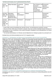 Verfahrenshinweise der Ausländerbehörde Berlin Danach benötigen drittstaatsangehörige Arbeitnehmer, die in einem anderen Mitgliedstaat der EU die Rechtsstellung eines langfristig Aufenthaltsberechtigten besitzen, kein Visum (mehr), wenn sie bis zu 90 Tage innerhalb von zwölf Monaten eine Dienstleistung nach § 21 BeschV in Deutschland erbringen. B.AufenthV.18. Befreiung für Inhaber von Reiseausweisen für Flüchtlinge frei B.AufenthV.19. Befreiung für Inhaber dienstlicher Pässe Mit Inkrafttreten der 8. VO zur Änderung der AufenthV zum 05.03.2013 sind nun auch Inhaber von Diplomatenpässen von Ecuador und Georgien sowie Inhaber von ecuadorianischen Dienstpässen von der Visumpflicht für die Einreise und den Kurzaufenthalt befreit. Die EU hat die bestehenden Visaerleichterungsabkommen mit der Ukraine und der Republik Moldau durch weitere Abkommen, die seit dem 01.07.2013 Anwendung finden, geändert. Gem. Art. 10 Abs. 2 der Abkommen können Inhaber von biometrischen Dienstpässen der Ukraine und der Republik Moldau visumfrei für höchstens 90 Tage pro Zeitraum von 180 Tagen in das Gebiet der Mitgliedstaaten einreisen und sich darin aufhalten. B.AufenthV.20. Befreiung für Inhaber von Ausweisen der Europäischen Union und zwischenstaatlichen Organisationen und der Vatikanstadt frei B.AufenthV.21. Befreiung für Inhaber von Grenzgängerkarten frei B.AufenthV.22. Befreiung für Schüler auf Sammellisten Nach § 22 benötigen Schüler, die nicht Angehörige eines Mitgliedstaates der EU oder des EWR sind, jedoch in einem solchen Staat ihren Wohnsitz haben, bei Schulreisen innerhalb der EU und des EWR keinen Aufenthaltstitel, sofern sie die Berechtigung zur Rückkehr in den Herkunftsstaat durch eine "Liste der Reisenden" nachweisen und der Zielstaat sowie die Transitstaaten die entsprechenden EU- Regelungen in nationales Recht übernommen haben. Die "Liste der Reisenden" gilt für die Reiseteilnehmer, für die darin ein Lichtbild angebracht ist, gleichzeitig als Passersatz für diese Reise.Hierfür ist das Sachgebiet IV A 2 zentral zuständig. Es gilt folgendes Verfahren: Die Schule beantragt formlos unter Angabe von Zweck, Ziel und Dauer der Reise sowie der genauen Personalien der teilnehmenden ausländischen Schüler die Reisendenliste. Für die Schüler, die keinen eigenen Pass oder Passersatz besitzen, ist ein biometrisches Lichtbild beizufügen. Nach Überprüfung des aufenthaltsrechtlichen Status sind die Personalien der teilnehmenden Schüler in die Liste einzutragen und die Berechtigung zur Wiedereinreise in die Bundesrepublik Deutschland zu bestätigen. Auch Minderjährige und Heranwachsende, deren Aufenthalt geduldet wird oder die vom Erfordernis eines Aufenthaltstitels zum Beispiel als Angehörige von Diplomaten oder gem. § 27 befreit sind, können nach dem mit dem 2. ÄndG eingefügten § 22 Abs. 2 in die Reisendenliste eingetragen werden, wenn sie Schüler einer allgemeinbildenden oder berufsbildenden Schule sind und von einer Lehrkraft begleitet werden. Sie sind dann für die Wiedereinreise vom Erfordernis eines Aufenthaltstitels befreit. Bei Geduldeten ist Voraussetzung, dass im Vorgriff auf die erwartete Wiedereinreise entschieden wurde, die Duldung über das Datum der beabsichtigten Wiedereinreise hinaus zu verlängern. Dies kann nur durch das aktenhaltende Sachgebiet - im Regelfall IV A 2 selbst oder IV A 3 - 4 - erfolgen. Hierauf ist die Schule durch IV A 2 im Einzelfall hinzuweisen. Spricht der Geduldete dort nicht vor und/oder wird die Duldung nicht über den Tag der Wiedereinreise hinaus verlängert, kann der Betroffene nicht auf die Reisendenliste aufgenommen werden. Ist die Duldung dagegen ausweislich des AusReg über das Datum der beabsichtigten Wiedereinreise hinaus gültig, so kann IV A 2 den Geduldeten grundsätzlich ohne Abstimmung mit dem jeweils zuständigen Sachgebiet und ohne Einsicht in die Ausländerakte zu nehmen in die Liste der Reisenden aufnehmen. Sind andere Sachgebiete - insbesondere IV R 1 - 3 oder IV P - aktenführend, erfolgt die Aufnahme in die Reisendenliste nur im Einvernehmen mit dem zuständigen Sachgebiet. Merke: Bei Geduldeten ist auf der Liste gem. § 22 Absatz 2 anzuordnen, dass die Abschiebung nach der Wiedereinreise ausgesetzt wird. Diese Anordnung der aufschiebend bedingten Duldung ist erforderlich, weil mit einer Ausreise eine Duldung erlischt (vgl. Nr. 3.3.6 AufenthG VwV). Die Duldung, deren Wirkung aufschiebend bedingt mit der Wiedereinreise eintritt, ist auf der Schülersammelliste zu vermerken. Der Vermerk hat den Wortlaut: „Die Abschiebung des Schülers/der Schülerin/der Schüler ist nach der Wiedereinreise und bis zum … ausgesetzt (§ 22 Absatz 2 AufenthV).“ Für Schüler, die im Besitz einer Aufenthaltsgestattung .....(weggefallen)...sind, findet § 22 Abs. 2 entsprechend Anwendung. In jedem Fall wird bei Geduldeten und Gestatteten je eine Kopie der Reisendenliste zur Ausländerakte gegeben. Nach Abstimmung auf europäischer Ebene bestehen seitens des BMI keine Bedenken, auch Berufsschüler in die begünstigenden Regelungen mit einzubeziehen, so dass auch diese in die Liste der Reisenden aufgenommen werden können. Die Betreffenden sollten allerdings vorsorglich darauf hingewiesen werden, dass die Ausstellung einer Reisendenliste in diesen Fällen immer mit dem Risiko verbunden ist, dass die zuständigen Behörden in den Mitgliedstaaten - aus welchen Gründen auch immer - diese Liste nicht akzeptieren und deshalb Schwierigkeiten bei Einreise und Aufenthalt entstehen können. Nach dem Ausfüllen der Liste ist diese einem Beauftragten der Schule mit dem Hinweis auszuhändigen, dass die von der Schulleitung geforderten Angaben (Zeilen 1 - 4 sowie linkes Kästchen darunter) unbedingt einzutragen und vom Schulleiter - persönlich oder durch den allgemein bestellten Vertreter - gegenzuzeichnen sind. Merke: Die Eintragung und Gegenzeichnung hat gem. Nr. 3.3.6 AufenthG- VwV grundsätzlich vor der Bestätigung der Liste Die