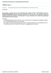Verfahrenshinweise der Ausländerbehörde Berlin VAB E Iran 1 E.Iran.1. Entscheidung über Aufenthaltstitel bei iranischen StA (20.07.2005) Es ist darauf zu achten, dass bei der Entscheidung über Anträge iranischer Staatsangehöriger stets die Meistbegünstigungsklausel des Deutsch-Iranischen Niederlassungsabkommens - NAK - vom 17.02.1929 zu beachten ist. Danach ist bei Iranern das Ermessen "wohlwollend" auszuüben, d. h., das Interesse des Antragstellers im Rahmen der gesetzlichen Möglichkeiten angemessen zu berücksichtigen. In negativen Bescheiden ist bei iranischen Staatsangehörigen deshalb immer auf das NAK einzugehen. Ausnahmen: Die Meistbegünstigungsklausel ist auf die Iraner, die von vornherein einen auf unabsehbare Zeit angelegten Aufenthalt (z. B. zu Arbeitszwecken) anstreben, nicht anzuwenden. Bei Anträgen auf kurzfristige Visaverlängerung gem. § 6 Abs. 3 AufenthG ist das NAK nur zu berücksichtigen, wenn es sich ausnahmsweise nicht um Schengen-C-Visa, sondern um nationale Besuchsvisa handelt. Dieses PDF wurde erstellt am: 23.08.2019 Seite 762 von 822