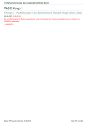 Verfahrenshinweise der Ausländerbehörde Berlin VAB E Kongo 1 E.Kongo.1. Rückführungen in die „Demokratische Republik Kongo“ (ehem. Zaire) (30.09.2007; 13.09.2018 ) Der seit 2001 bestehende Zustimmungsvorbehalt wurde mit Schreiben der Senatsverwaltung für Inneres und Sport vom 30.08.2018 aufgehoben. ...weggefallen... Dieses PDF wurde erstellt am: 23.08.2019 Seite 769 von 822
