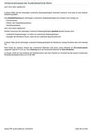 Verfahrenshinweise der Ausländerbehörde Berlin Geschlecht und Personenbeschreibung (Körpergröße, Augenfarbe etc.) Aliasnamen, sofern verwendet Familienstand, Personalangaben zu Ehegatten und Kindern (einschl. letztem Wohnort im Heimatland) sofern zutreffend Angaben zum Gesundheitszustand und lateinischer Name einer evt. ansteckenden Krankheit *) Hinweis auf evtl. Abhängigkeit von fremder Hilfe, Pflege und Fürsorge wegen Krankheit oder Alter - auch schutzbedürftige unbegleitete Minderjährige*) *) Aus datenschutzrechtlichen Gründen ist sicherzustellen, dass diese Gesundheitsdaten, soweit es sich nicht um ansteckende Krankheiten nach dem Bundesseuchengesetz handelt, nur in engem Kontakt mit dem Betroffenen erhoben und mit dessen Einvernehmen übermittelt werden. Darüber hinaus sind dem Ersuchen Nachweis- bzw. Glaubhaftmachungsmittel zur Identitäts- und Staatsangehörigkeitsfeststellung beizufügen. Dies sind Staatsangehörigkeitsurkunde Reisepass sonstige Dokumente (nationale Ausweise, abgelaufene Passersatzpapiere, Führerscheine, Geburtsurkunden, Seefahrtsbücher, Wehrpässe, Militärausweise sowie ggf. andere Dokumente, die bei der Feststellung der Identität und der Staatsangehörigkeit hilfreich sein könnten) Internationale Geburtsurkunde bei in Deutschland geborenen Kindern Die vorstehend genannten Unterlagen sind in Kopie beizufügen. Weiter sind erforderlich je 2 Lichtbilder für die zu übernehmende Person und ihre Kinder (unabhängig vom Lebensalter, d.h. auch für Säuglinge). Die vorstehend genannten benötigten Angaben und Unterlagen sind zum frühestmöglichen Zeitpunkt zu erheben bzw. zu den Akten zu nehmen. Sind die zwingend erforderlichen Angaben nicht aktenkundig, so sind sie beim Betroffenen unter Verwendung des Formbriefes “JUGWOHN”(s. Anlage zu E.Serb.1.) oder des Word-Dokuments „Personalbogen serbokroatisch“ (Nöldnerstr. Laufwerk G:, Ordner IV R 3/Unterordner IV R 3 Allgemein/Unterordner Jugo Dokument „Personalbogen serbokroatisch“) zu erheben. Als besonders eilbedürftig gekennzeichnete Übernahmeersuchen (z.B. in Fällen von Abschiebungshaft) werden bevorzugt bearbeitet. Sie können per Fax über IV R 3 an das zuständige Innenministerium übersandt werden. 1.2. Adressat Für die Frage, an welches Innenministerium auf serbischer bzw. montenegrinischer Seite die Übernahmeersuchen zu richten sind, ist der letzte Wohnort bzw. – sofern nicht bekannt – der Geburtsort der rückzuführenden Person maßgebend. Wird ein Übernahmeersuchen an ein hierfür nicht zuständiges Innenministerium gerichtet, leitet dieses es unverzüglich, spätestens innerhalb von 10 Werktagen, an das Innenminsterium der anderen Republik weiter und unterrichtet die deutsche Seite hierüber. Für Staatsangehörige der Republik Montenegro ist das Rückübernahmeersuchen von der ABH an das Ministerium des Innern der Republik Montenegro Abteilung für Verwaltungsangelegenheiten Bulevar Svetog Petra Cetinjskog br. 20 81000 Podgorica zu richten. 2. Antwort auf Ersuchen Die montenegrinische Seite (Innenministerium) hat auf das Ersuchen mitzuteilen: Dieses PDF wurde erstellt am: 23.08.2019 Seite 779 von 822