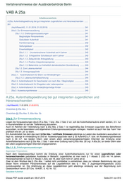 Verfahrenshinweise der Ausländerbehörde Berlin VAB A 25a Inhaltsverzeichnis A.25a. Aufenthaltsgewährung bei gut integrierten Jugendlichen und Heranwachsenden ...... 241 (AsylVfbeschlG, 11.01.2019; 21.03.2019) ................................................................. 241 25a.0. Zur Ermessensausübung ............................................................................... 241 25a.1.1.0. Erteilungsvoraussetzungen ............................................................... 241 Begünstigter Personenkreis ........................................................................ 241 Geduldeter Aufenthalt ................................................................................. 241 Familiennachzug ......................................................................................... 242 Geltungsdauer ............................................................................................. 242 Erwerbstätigkeit ........................................................................................... 242 25a.1.1.1. Ununterbrochener Aufenthalt seit 4 Jahren ............................. 242 25a.1.1.2. Erfolgreicher Schulbesuch seit 4 Jahren ................................... 242 25a.1.1.3. Zeitpunkt der Antragstellung ...................................................... 243 25a.1.1.4. Positive Integrationsprognose .................................................... 243 25a.1.1.5. Bekenntnis zur freiheitlich demokratischen Grundordnung ........ 243 25a.1.2. Zum Lebensunterhalt ........................................................................... 244 25a.1.3. Versagungsgründe ............................................................................... 244 25a.2.1. Aufenthaltsrecht für Eltern von Minderjährigen ......................................... 244 25a.2.1.2. Lebensunterhaltssicherung ............................................................... 244 25a.2.2. Aufenthaltsrecht für Geschwister von nach Abs.1 Begünstigten ................. 244 25a.2.3. Aufenthaltsrecht für Ehegatten oder Lebenspartner .................................... 245 25a.2.4. Aufenthaltsrecht für minderjährige ledige Kinder ......................................... 245 25a.3. Ausweisungsinteresse .................................................................................... 245 A.25a. Aufenthaltsgewährung bei gut integrierten Jugendlichen und Heranwachsenden ( AsylVfbeschlG, 11.01.2019; 21.03.2019 ) Checkliste § 25a Abs. 1 Checkliste §§ 25a Abs. 2, 60a Abs. 2b 25a.0. Zur Ermessensausübung Liegen die Voraussetzungen des § 25 a Abs. 1 bzw. Abs. 2 Satz 2 vor, soll die Aufenthaltserlaubnis erteilt werden, d.h. nur in Ausnahmefällen ist von der Titelerteilung abzusehen. Auch im Rahmen der Titelerteilung nach § 25a Abs. 2 Satz 1 ist regelmäßig das Ermessen zugunsten des Betroffenen auszuüben, so die besonderen und allgemeinen Erteilungsvoraussetzungen vorliegen. Insofern ist auch hier das “kann“ hier praktisch wie ein „ist“ zu lesen. Ein Ausnahmefall, bei dem das nach § 25a Abs. 1 eröffnete Ermessen allerdings zu Lasten des Ausländers auszuüben ist, liegt vor, solange er minderjährig ist und Ist- Ausweisungsgründe nach § 53 AufenthG a.F. bzw. ein Ausweisungsinteresse nach § 54 n.F. bei beiden Eltern oder einem allein personensorgeberechtigten Elternteil der Erteilung einer Aufenthaltserlaubnis nach § 25a Abs. 2 Satz 1 oder einer Duldung nach § 60a Abs. 2b (vgl. A.60a.2b.) an beide Eltern oder den allein sorgeberechtigten Elternteil entgegenstehen. 25a.1.1. 0 . Erteilungsvoraussetzungen Begünstigter Personenkreis Nach dem Gesetzeswortlaut kommt die Erteilung einer Aufenthaltserlaubnis nur für einen jugendlichen oder heranwachsenden geduldeten Ausländer in Betracht. Jugendlicher ist man nach § 1 Absatz 2 JGG mit 14 Jahren. Heranwachsender ist nach § 1 Absatz 2 JGG, wer 18, aber noch nicht 21 Jahre alt ist. Zwar ist dem Wortlaut des § 25a Abs. 1 selbst nicht unmittelbar zu entnehmen, dass zur näheren Bestimmung des von dieser Norm erfassten Personenkreises auf die Legaldefinition des § 1 Abs. 2 Jugendgerichtsgesetzes (JGG) zurückzugreifen ist. Die Anlehnung an diese Legaldefinition geht allerdings eindeutig aus der Begründung zum Gesetzentwurf hervor (BT-Drs. 18/4097, S. 42, Nr. 12). Geduldeter Aufenthalt Dieses PDF wurde erstellt am: 08.07.2019 Seite 241 von 815