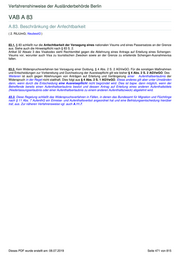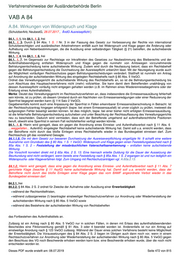 Verfahrenshinweise der Ausländerbehörde Berlin VAB A 83 A.83. Beschränkung der Anfechtbarkeit ( 2. RiLiUmG; NeubestG ) 83.1. § 83 schließt nur die Anfechtbarkeit der Versagung eines nationalen Visums und eines Passersatzes an der Grenze aus. Siehe auch die Hinweispflicht nach § 83 S. 2. Artikel 32 Absatz 3 des Visakodex sieht Rechtsmittel gegen die Ablehnung eines Antrags auf Erteilung eines Schengen- Visums vor, worunter auch Visa zu touristischen Zwecken sowie an der Grenze zu erteilende Schengen-Ausnahmevisa fallen. 83.2. Kein Widerspruchsverfahren bei Versagung einer Duldung, § 4 Abs. 2 S. 2 AGVwGO. Für die sonstigen Maßnahmen und Entscheidungen zur Vorbereitung und Durchsetzung der Ausreisepflicht gilt wie bisher § 4 Abs. 2 S. 2 AGVwGO. Des Weiteren ist auch gegen Ablehnungen von Anträgen auf Erteilung und Verlängerung einer Aufenthaltserlaubnis der Widerspruch in der Regel nicht statthaft. Dies folgt aus § 4 Abs. 2 S. 1 AGVwGO. Etwas anderes gilt aber unter Umständen dann, wenn durch die Entscheidung eine Ausreisepflicht nicht begründet wird. Dies ist bspw. dann möglich, wenn der Betreffende bereits einen Aufenthaltserlaubnis besitzt und dessen Antrag auf Erteilung eines anderen Aufenthaltstitels (Niederlassungserlaubnis oder einer Aufenthaltserlaubnis zu einem anderen Aufenthaltszweck) abgelehnt wird. 83.3. Diese Regelung schließt das Widerspruchsverfahren in Fällen, in denen das Bundesamt für Migration und Flüchtlinge nach § 11 Abs. 7 AufenthG ein Einreise- und Aufenthaltsverbot angeordnet hat und eine Befristungsentscheidung hierüber traf, aus. Zur näheren Verfahrensweise vgl. auch A.11.7. Dieses PDF wurde erstellt am: 08.07.2019 Seite 471 von 815