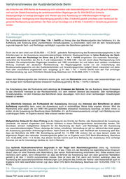 Verfahrenshinweise der Ausländerbehörde Berlin das Erlöschen des ARB-Rechts die Ausweisung nicht vollziehbar oder bestandskräftig sein muss. Dies gilt auch deswegen, weil nach der Ziebell-Entscheidung die verfahrensrechtlichen Regelungen der RL 2004/38/EG auf türkische Staatsangehörige nur bedingt übertragbar sind. Werden also trotz Ausweisung von ARB-Berechtigten Anträge auf Ausstellung bzw. Verlängerung einer Bescheinigung gemäß § 4 Abs. 5 AufenthG gestellt, sind diese unter Verweis auf die genannte Rechtsprechung abzulehnen. Der Pass soll auf Grundlage von § 50 Abs. 5 AufenthG in Verwahrung genommen werden. 3.3. Wiederaufgreifen bestandskräftig abgeschlossener Verfahren, Rücknahme bestandskräftiger Ausweisungen Die Ausländerbehörde hat nach § 51 Abs. 1 Nr. 1 VwVfG auf Antrag über das Wiederaufgreifen des Verfahrens, d.h. die Aufhebung oder Änderung eines unanfechtbaren Verwaltungsaktes zu entscheiden, wenn sich die dem Verwaltungsakt zugrunde liegende Sach- und Rechtslage nachträglich zugunsten des Betroffenen geändert hat. Durch die mit dem Urteil vom 03.08.2004 – 1 C 29.02 - geänderte Rechtsprechung des Bundesverwaltungsgerichts zu den Anforderungen an die Ausweisung assoziationsberechtigter türkischer Staatsangehöriger ist keine Änderung der Sach- und auch nicht der Rechtslage im Sinne des § 51 Abs. 1 Nr. 1 VwVfG eingetreten. Die materielle Rechtslage - namentlich die Vorschriften der Art. 6, 7 und insbesondere 14 ARB 1/80 - hat sich durch diese Rechtsprechung nicht verändert. Die entsprechenden Regelungen bestehen seit 1980 unverändert fort und haben auch seitdem unmittelbare Wirkung innerhalb der deutschen Rechtsordnung. Ihr Regelungsgehalt wurde vor der Entscheidung des Bundesverwaltungsgerichts von den Ausländerbehörden und Verwaltungsgerichten lediglich falsch interpretiert und daher nicht oder unzutreffend angewendet bzw. ausgelegt. § 51 Abs. 1 Nr. 1 VwVfG betrifft nicht den Fall unrichtiger Rechtsanwendung (vgl. auch OVG Berlin-Brandenburg, Beschluss vom 10.05.2006, OVG 11 S 40.05). Neben dem Wiederaufgreifen des Verfahrens kommt grds. auch die Rücknahme einer rechts- oder bestandskräftigen und aus heutiger Sicht rechtswidrigerweise erlassenen Ausweisung gemäß § 48 Abs. 1 VwVfG in Betracht. Die Entscheidung über die Rücknahme steht allerdings im Ermessen der Behörde. Bei der Ausübung dieses Ermessens ist das öffentliche Interesse an der Rechtssicherheit, d.h. dem weiteren Bestand des bestands- oder rechtskräftigen Verwaltungsaktes, mit dem Interesse des Betroffenen daran abzuwägen, nicht durch einen rechtswidigen Verwaltungsakt belastet zu werden. Das öffentliche Interesse am Fortbestand der Ausweisung überwiegt das Interesse des Betroffenen an deren Aufhebung regelmäßig dann, wenn die Ausweisung auch in rechtmäßiger Weise hätte ergehen können: Wird die Rücknahme einer gegen die von ARB 1/80 gesetzen Maßstäbe erlassenen Ausweisung beantragt, ist daher immer zu prüfen, ob die Ausweisung bei Beachtung dieser Maßstäbe, d.h. als Ermessensausweisung und ggf. nach Beteiligung einer unabhängigen Stelle, im Ergebnis ebenso hätte erlassen werden können. Maßgeblicher Zeitpunkt für diese Prüfung ist der Zeitpunkt des Eintritts der Rechts- oder Bestandskraft der Ausweisung. Umstände, die danach eingetreten sind, können höchtens in einem Befristungsverfahren berücksichtigt werden. Der Grundsatz, wonach maßgeblicher Zeitpunkt für die Beurteilung der Sach- und Rechtslage bei der Ausweisung von assoziationsberechtigten Türken, derjenige der letzten mündlichen Verhandlung ist, gilt nur während des direkt gegen die Ausweisung gerichteten Anfechtungsverfahren. Nach Eintritt der Bestands- oder Rechtkraft der Ausweisung steht fest, dass der Betroffene die ARB 1/80- Berechtigung gemäß Art. 14 ARB 1/80 verloren hat, so dass danach wieder die allgemeinen Regeln des nationalen Verwaltungsrechts gelten (so im Ergebnis auch OVG Berlin-Brandenburg, Beschluss vom 10.05.2006, OVG 11 S 40.05). Aus diesem Grunde kommt auch eine Befristung der Ausweisung ohne vorherige Ausreise, wie sie für Unionsbürger denkbar ist, nicht in Betracht. Das laufende Rücknahmeverfahren begründet in der Regel kein Abschiebungsverbot (etwa wg. rechtlicher Unmöglichkeit gemäß § 60a Abs. 2 AufenthG i.V.m. Art. 19 abs. 4 GG), d.h. der Betroffene hat regelmäßig keinen Anspruch darauf, dass vor einer Ausreise oder Abschiebung über seinen Rücknahmeantrag entschieden wird. Etwas anderes kann höchstens dann gelten, wenn offensichtlich ist, dass die Behörde die Ausweisung nach den oben genannten Maßstäben gemäß § 48 Abs. 1 VwVfG zurücknehmen müsste. Dies ist dann der Fall, wenn sich förmlich aufdrängt, dass die Ausweisung den assoziationsrechtlichen Anforderungen zum Zeitpunkt des Eintritts der Rechts- oder Bestandskraft auch im Ergebnis nicht hätte standhalten können (vgl. dazu näher OVG Berlin-Brandenburg, Beschluss vom 10.05.2006, OVG 11 S 40.05). 3.4. Übertragbarkeit von Verfahrensgrundsätzen für die Ausweisung von Unionsbürgern auf ARB 1/80 - berechtigte türkische Staatsangehörige Dieses PDF wurde erstellt am: 08.07.2019 Seite 806 von 815