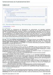 Verfahrenshinweise der Ausländerbehörde Berlin VAB A 61 Inhaltsverzeichnis A.61. Räumliche Beschränkung, Wohnsitzauflage, Ausreiseeinrichtungen ................................................................ 428 ( 2. ÄndGAusreisepflicht; 17.10.2019) ................................................................................................................. 428 61.0. Allgemeines ................................................................................................................................................. 428 61.1.1. Allgemeine Hinweise zur räumlichen Beschränkung ............................................................................... 428 61.1.1.1. Zweitduldung .................................................................................................................................. 428 61.1.1.2. Wohnortwechsel ............................................................................................................................. 429 61.1.2. Zur räumlichen Beschränkung bei Beschäftigung oder Bestehen einer familiären Lebensgemeinschaft ...... 429 61.1b. Erlöschen der räumlichen Beschränkung kraft Gesetzes ......................................................................... 429 61.1c. Wiederanordnung der räumlichen Beschränkung ..................................................................................... 429 61.1d. Wohnsitzauflage ........................................................................................................................................ 430 A.61. Räumliche Beschränkung, Wohnsitzauflage, Ausreiseeinrichtungen ( 2. ÄndGAusreisepflicht; 17.10.2019) 61.0. Allgemeines Mit dem Gesetz zur Verbesserung der Rechtsstellung von asylsuchenden und geduldeten Ausländern (Rechtsstellungsverbesserungsgesetz) hat der Gesetzgeber u.a. Lockerungen bei der räumlichen Beschränkung für Geduldete (und Asylbewerber) sowie Änderungen im Rahmen der Wohnsitzauflage vorgenommen. Wie zuvor sieht § 61 Abs. 1 für vollziehbar Ausreisepflichtige das Entstehen der räumlichen Beschränkung kraft Gesetzes mit den bisherigen Ausnahmemöglichkeiten vor, die allerdings praktisch keine Relevanz mehr haben (siehe A.61.1.1.). Mit der Neuregelung wird die räumliche Beschränkung nämlich kraft Gesetzes auf faktisch 3 Monate nach Einreise in das Bundesgebiet befristet (§ 61 Abs. 1b; näheres unter A.61.1b.). In bestimmten Fällen wird der Ausländerbehörde allerdings die Möglichkeit eröffnet, eine erloschene räumliche Beschränkung der Duldung (wieder) anzuordnen (§ 61 Abs. 1c; siehe A.61.1c.). 61.1.1. Allgemeine Hinweise zur räumlichen Beschränkung § 61 Abs. 1 gilt für alle vollziehbar Ausreisepflichtigen, das heißt auch für Personen, die eine GÜB I oder – etwa wegen eines Petitionsverfahrens oder eines Verwaltungsprozesses – eine GÜB II erhalten haben. Auch deren Aufenthalt ist von Gesetzes wegen räumlich beschränkt (zur Strafbarkeit bei wiederholtem Verstoß vgl. § 95 Abs. 1 Nr. 7). Beachte aber auch § 46 Abs. 1 und die Möglichkeiten des § 12 Abs. 5 (zur räumlichen Beschränkung bei geduldeten unbegleiteten Minderjährigen vgl. Ausführungen unter D.51.0. 3.). Sofern eine räumliche Beschränkung verfügt wird, gilt Folgendes: Die Weisung der Senatsverwaltung für Inneres und Sport vom 29.07.2010, wonach die räumliche Beschränkung in bestimmten Fällen auf das Land Brandenburg erweitert werden kann, ist vor dem Hintergrund des § 61 Abs. 1 b und c obsolet. Mit Blick auf die genannten Vorschriften sind die entsprechenden Nebenbestimmungen anlassbezogen zu streichen und ist ggf. die räumliche Beschränkung gem. § 61 Abs. 1 c auf das Land Berlin zu prüfen. Entsprechendes gilt für die frühere Regelung, die jungen Geduldeten die Teilnahme an Klassen- und Jugendreisen im Bundesgebiet ermöglichen sollte. Auch hier ist die frühere Nebenbestimmung : "Teilnahme an Klassen- sowie Kinder- und Jugendgruppenreisen innerhalb Deutschlands gestattet.“ anlassbezogen zu streichen und nicht mehr zu verfügen. Etwas anderes gilt allerdings, wenn es sich bei dem jungen Geduldeten um einen ehemaligen Asylbewerber aus einem sicheren Herkunftsstaat (vgl § 29a AsylG) handelt, dessen Asylverfahren nach § 29a AsylG als offensichtlich unbegründet abgelehnt bzw. nach § 27a AsylG als unzulässig zurückgewiesen wurde. Für diesen Personenkreis besteht die Verpflichtung, in einer Aufnahmeeinrichtung zu wohnen, bis zur Ausreise bzw. Abschiebung fort; damit einhergehend ist in diesen Fällen regelmäßig die räumliche Beschränkung der Duldung zu verfügen. Jungen Geduldeten, die das 21. Lebensjahr noch nicht vollendet haben, ist aber unabhängig vom Duldungsgrund gem. § 12 Abs. 5 S. 1 zu ermöglichen, als Schüler an Klassenreisen oder als Mitglieder von Kinder- oder Jugendgruppen von Kurzreisen in das übrige Bundesgebiet teilzunehmen. Bei Vorsprache zum Zwecke der Erteilung oder Verlängerung der Duldung, ist daher folgende Nebenbestimmung zu verfügen: „Teilnahme an Klassen- sowie Kinder- und Jugendgruppenreisen innerhalb Deutschlands gestattet.“ Von der Erhebung einer Gebühr wird gem. § 53 Abs. 2 AufenthV generell abgesehen (bzgl. sonstiger Reisen in Deutschland etwa für Pflegekinder oder Kinder und Jugendliche, die in Jugendhilfeeinrichtungen untergebracht sind, vgl. A.12.5.; für Auslandsreisen B.AufenthV.22.). 61.1.1. 1. Zweitduldung Durch die mit dem Inkrafttreten des Rechtsstellungsverbesserungsgesetzes verbundenen Lockerungen im Bereich der räumlichen Beschränkungen und Wohnsitzauflagen stellt sich in vielen Fällen auch die Frage der Erteilung einer sog. Zweitduldung nicht mehr. Sie stellt sich lediglich in den Fällen, in denen der Aufenthalt eines in einem anderen Bundesland Dieses PDF wurde erstellt am: 29.11.2019 Seite 428 von 824