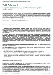 Verfahrenshinweise der Ausländerbehörde Berlin VAB E Afghanistan 2 E.Afghan.2. Bleiberechtsregelung für afghanische Staatsangehörige (20.07.2005; 05.06.2007) Zur Regelung insbesondere der Fälle, die schon seit Jahren in Deutschland faktisch wirtschaftlich und sozial integriert sind und bei der Rückkehr eine eigenständig geschaffene und gesicherte Lebensgrundlage aufgeben müssten, wurde in den Sitzungen der Innenminister und –senatoren der Länder am 19.11.2004 bzw. 24.06.2005 beschlossen, dass diese Personen aus humanitären Gründen und zur Vermeidung außergewöhnlicher Härten dauerhaft von der Durchsetzung der Rückkehrverpflichtung ausgenommen werden können. Die Senatsverwaltung für Inneres hat auf der Grundlage dieser Beschlüsse im Einvernehmen mit dem Bundesministerium des Innern gemäß § 23 Abs. 1 AufenthG Folgendes angeordnet: I. Eine Aufenthaltserlaubnis ist zu erteilen 1. Personen, die am 24. Juni 2005 das 65. Lebensjahr vollendet hatten, sofern sie in Afghanistan keine Familie, dafür aber im Bundesgebiet Angehörige (Kinder und Enkel) mit dauerhaften Aufenthalt bzw. deutscher Staatsangehörigkeit haben und soweit sichergestellt ist, dass für diesen Personenkreis keine Sozialleistungen mit Ausnahme von Leistungen für die Versorgung im Krankheitsfalle und bei Pflegebedürftigkeit in Anspruch genommen werden; § 26 Abs. 2 AufenthG findet keine Anwendung, 2. Personen, die sich am 24. Juni 2005 seit mindestens sechs Jahren ununterbrochen erlaubt, gestattet oder geduldet im Bundesgebiet aufhalten und seit mehr als zwei Jahren in einem dauerhaften Beschäftigungsverhältnis stehen. Kurzfristige Unterbrechungen des Arbeitsverhältnisses sind unschädlich, sofern eine Beschäftigung auf Dauer möglich ist. Das Kriterium der Kurzzeitigkeit der Unterbrechung bestimmt sich u.a. nach dem Gesamtbeschäftigungszeitraum und ist einzelfallbezogen großzügig zu handhaben. Eine Unterbrechung ist deshalb in der Regel dann als unschädlich zu betrachten, wenn die Unterbrechung in einem Zeitraum von zwei Jahren nicht mehr als drei Monate beträgt. Diese Regel ist auch auf mögliche Unterbrechungen des erlaubten oder geduldeten Aufenthalts anzuwenden. Weiter ist das Vorliegen und Fortbestehen folgender Integrationsbedingungen am 24. Juni 2005 Voraussetzung für die Erteilung der Aufenthaltserlaubnis: Der Lebensunterhalt ist durch eigene legale Erwerbstätigkeit ohne zusätzliche Mittel der Sozialhilfe gesichert. Ausnahmen hiervon sind in besonderen Härtefällen zu machen: bei Auszubildenden in anerkannten Lehrberufen, bei Familien mit Kindern, die vorübergehend auf ergänzende Hilfe zum Lebensunterhalt angewiesen sind bei Alleinerziehenden mit Kindern, soweit ihnen nach § 10 Abs. 1 Nr. 3 SGB II eine Arbeitsaufnahme nicht zumutbar ist, bei erwerbsunfähigen Personen, deren Lebensunterhalt einschließlich einer erforderlichen Betreuung und Pflege in sonstiger Weise ohne Leistungen der öffentlichen Hand dauerhaft gesichert ist, es sei denn, die Leistungen beruhen auf Beitragszahlungen. Ausreichender Wohnraum muss vorhanden sein. Der tatsächliche Schulbesuch aller Kinder für den gesamten Zeitraum zwischen dem Beginn und dem Ende des schulfähigen Alters muss durch Zeugnisvorlage nachgewiesen werden. In die Regelung einbezogen sind der Ehegatte und die minderjährigen Kinder. Ebenfalls einbezogen sind die bei ihrer Einreise minderjährig gewesenen, unverheirateten Kinder, sofern es gewährleistet erscheint, dass sie sich auf Grund ihrer bisherigen Ausbildung und Lebensverhältnisse dauerhaft integrieren werden. Eine solche Prognose kann bereits dann angenommen werden, wenn sie die Ausbildung zu einem anerkannten Ausbildungs- oder Schulabschluss durchlaufen. Im Bundesgebiet lebende Ehegatten und einbezogene Kinder können eine Aufenthaltserlaubnis auch dann erhalten, wenn ihr Aufenthalt weniger als sechs Jahre beträgt. Dieses PDF wurde erstellt am: 29.11.2019 Seite 749 von 824