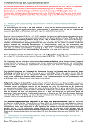 Verfahrenshinweise der Ausländerbehörde Berlin das Erlöschen des ARB-Rechts die Ausweisung nicht vollziehbar oder bestandskräftig sein muss. Dies gilt auch deswegen, weil nach der Ziebell-Entscheidung die verfahrensrechtlichen Regelungen der RL 2004/38/EG auf türkische Staatsangehörige nur bedingt übertragbar sind. Werden also trotz Ausweisung von ARB-Berechtigten Anträge auf Ausstellung bzw. Verlängerung einer Bescheinigung gemäß § 4 Abs. 5 AufenthG gestellt, sind diese unter Verweis auf die genannte Rechtsprechung abzulehnen. Der Pass soll auf Grundlage von § 50 Abs. 5 AufenthG in Verwahrung genommen werden. 3.3. Wiederaufgreifen bestandskräftig abgeschlossener Verfahren, Rücknahme bestandskräftiger Ausweisungen Die Ausländerbehörde hat nach § 51 Abs. 1 Nr. 1 VwVfG auf Antrag über das Wiederaufgreifen des Verfahrens, d.h. die Aufhebung oder Änderung eines unanfechtbaren Verwaltungsaktes zu entscheiden, wenn sich die dem Verwaltungsakt zugrunde liegende Sach- und Rechtslage nachträglich zugunsten des Betroffenen geändert hat. Durch die mit dem Urteil vom 03.08.2004 – 1 C 29.02 - geänderte Rechtsprechung des Bundesverwaltungsgerichts zu den Anforderungen an die Ausweisung assoziationsberechtigter türkischer Staatsangehöriger ist keine Änderung der Sach- und auch nicht der Rechtslage im Sinne des § 51 Abs. 1 Nr. 1 VwVfG eingetreten. Die materielle Rechtslage - namentlich die Vorschriften der Art. 6, 7 und insbesondere 14 ARB 1/80 - hat sich durch diese Rechtsprechung nicht verändert. Die entsprechenden Regelungen bestehen seit 1980 unverändert fort und haben auch seitdem unmittelbare Wirkung innerhalb der deutschen Rechtsordnung. Ihr Regelungsgehalt wurde vor der Entscheidung des Bundesverwaltungsgerichts von den Ausländerbehörden und Verwaltungsgerichten lediglich falsch interpretiert und daher nicht oder unzutreffend angewendet bzw. ausgelegt. § 51 Abs. 1 Nr. 1 VwVfG betrifft nicht den Fall unrichtiger Rechtsanwendung (vgl. auch OVG Berlin-Brandenburg, Beschluss vom 10.05.2006, OVG 11 S 40.05). Neben dem Wiederaufgreifen des Verfahrens kommt grds. auch die Rücknahme einer rechts- oder bestandskräftigen und aus heutiger Sicht rechtswidrigerweise erlassenen Ausweisung gemäß § 48 Abs. 1 VwVfG in Betracht. Die Entscheidung über die Rücknahme steht allerdings im Ermessen der Behörde. Bei der Ausübung dieses Ermessens ist das öffentliche Interesse an der Rechtssicherheit, d.h. dem weiteren Bestand des bestands- oder rechtskräftigen Verwaltungsaktes, mit dem Interesse des Betroffenen daran abzuwägen, nicht durch einen rechtswidigen Verwaltungsakt belastet zu werden. Das öffentliche Interesse am Fortbestand der Ausweisung überwiegt das Interesse des Betroffenen an deren Aufhebung regelmäßig dann, wenn die Ausweisung auch in rechtmäßiger Weise hätte ergehen können: Wird die Rücknahme einer gegen die von ARB 1/80 gesetzen Maßstäbe erlassenen Ausweisung beantragt, ist daher immer zu prüfen, ob die Ausweisung bei Beachtung dieser Maßstäbe, d.h. als Ermessensausweisung und ggf. nach Beteiligung einer unabhängigen Stelle, im Ergebnis ebenso hätte erlassen werden können. Maßgeblicher Zeitpunkt für diese Prüfung ist der Zeitpunkt des Eintritts der Rechts- oder Bestandskraft der Ausweisung. Umstände, die danach eingetreten sind, können höchtens in einem Befristungsverfahren berücksichtigt werden. Der Grundsatz, wonach maßgeblicher Zeitpunkt für die Beurteilung der Sach- und Rechtslage bei der Ausweisung von assoziationsberechtigten Türken, derjenige der letzten mündlichen Verhandlung ist, gilt nur während des direkt gegen die Ausweisung gerichteten Anfechtungsverfahren. Nach Eintritt der Bestands- oder Rechtkraft der Ausweisung steht fest, dass der Betroffene die ARB 1/80- Berechtigung gemäß Art. 14 ARB 1/80 verloren hat, so dass danach wieder die allgemeinen Regeln des nationalen Verwaltungsrechts gelten (so im Ergebnis auch OVG Berlin-Brandenburg, Beschluss vom 10.05.2006, OVG 11 S 40.05). Aus diesem Grunde kommt auch eine Befristung der Ausweisung ohne vorherige Ausreise, wie sie für Unionsbürger denkbar ist, nicht in Betracht. Das laufende Rücknahmeverfahren begründet in der Regel kein Abschiebungsverbot (etwa wg. rechtlicher Unmöglichkeit gemäß § 60a Abs. 2 AufenthG i.V.m. Art. 19 abs. 4 GG), d.h. der Betroffene hat regelmäßig keinen Anspruch darauf, dass vor einer Ausreise oder Abschiebung über seinen Rücknahmeantrag entschieden wird. Etwas anderes kann höchstens dann gelten, wenn offensichtlich ist, dass die Behörde die Ausweisung nach den oben genannten Maßstäben gemäß § 48 Abs. 1 VwVfG zurücknehmen müsste. Dies ist dann der Fall, wenn sich förmlich aufdrängt, dass die Ausweisung den assoziationsrechtlichen Anforderungen zum Zeitpunkt des Eintritts der Rechts- oder Bestandskraft auch im Ergebnis nicht hätte standhalten können (vgl. dazu näher OVG Berlin-Brandenburg, Beschluss vom 10.05.2006, OVG 11 S 40.05). 3.4. Übertragbarkeit von Verfahrensgrundsätzen für die Ausweisung von Unionsbürgern auf ARB 1/80 - berechtigte türkische Staatsangehörige Dieses PDF wurde erstellt am: 29.11.2019 Seite 815 von 824