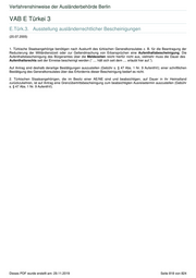 Verfahrenshinweise der Ausländerbehörde Berlin VAB E Türkei 3 E.Türk.3. Ausstellung ausländerrechtlicher Bescheinigungen (20.07.2005) 1. Türkische Staatsangehörige benötigen nach Auskunft des türkischen Generalkonsulates z. B. für die Beantragung der Reduzierung der Militärdienstzeit oder zur Geltendmachung von Erbansprüchen eine Aufenthaltsbescheinigung. Die Aufenthaltsbescheinigung des Bürgeramtes über die Meldezeiten reicht hierfür nicht aus, vielmehr muss die Dauer des Aufenthaltsrechts seit der Einreise bescheinigt werden (“ .... hält sich seit dem .... erlaubt hier auf.”). Auf Antrag sind deshalb derartige Bestätigungen auszustellen (Gebühr s. § 47 Abs. 1 Nr. 9 AufenthV); einer schriftlichen Bestätigung des Generalkonsulates über das Erfordernis dieser Bescheinigung bedarf es nicht. 2. Türkischen Staatsangehörigen, die im Besitz einer AE/NE sind und beabsichtigen, auf Dauer in ihr Heimatland zurückzukehren, ist auf Antrag eine Grenzübertrittsbescheinigung zum beabsichtigten Ausreisetermin auszustellen (Gebühr s. § 47 Abs. 1 Nr. 9 AufenthV). Dieses PDF wurde erstellt am: 29.11.2019 Seite 818 von 824
