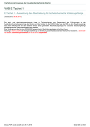 Verfahrenshinweise der Ausländerbehörde Berlin VAB E Tschet 1 E.Tschet.1. Aussetzung der Abschiebung für tschetschenische Volkszugehörige ( 02.02.2012; 06.08.2015 ) Die asyl- und abschiebungsrelevante Lage in Tschetschenien war Gegenstand der Erörterungen in der Ausländerreferentenbesprechung des Bundes und der Länder im April 2003. Dabei war das BMI zu dem Ergebnis gelangt, dass kein Anhaltspunkt für den weiteren Erlass eines generellen Abschiebungsstopps für russische Staatsangehörige tschetschenischer Volkszugehörigkeit mehr besteht. Eine Verlängerung des bis zum 20.06.2003 angeordneten Abschiebungsstopps schied damit aus. Allerdings blieb zunächst die Vorlageverpflichtung vor Einleitung aufenthaltsbeendender Maßnahmen bestehen. SenInnDS hat diesen Zustimmungsvorbehalt am 05.08.2015 aufgehoben. Dieses PDF wurde erstellt am: 29.11.2019 Seite 820 von 824