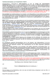 Verfahrenshinweise zum Aufenthalt in Berlin In den Fällen, in denen die Berufsausbildung in vorwiegend schulischer Form erfolgt, bedarf es einer Bestätigung der Ausbildungseinrichtung über die Zulassung. Dafür genügt weiterhin die Vorlage einer aktuellen Aufnahmeentscheidung im Sinne der geltenden Ausbildungs- und Prüfungsverordnung, sofern daraus der Berufsabschluss und die Ausbildungsdauer hervorgehen. 60c.3.4. Die Ausbildungsduldung ist nach dem klaren Wortlaut der Vorschrift ausnahmslos für die gesamte Dauer der Berufsausbildung zu erteilen. Dadurch soll den Ausbildungsbetrieben Planungssicherheit verschafft und das aufenthaltsrechtliche Verfahren vereinfacht werden. Eine kürzere Erteilung ist auch bei Minderjährigen nicht gerechtfertigt, da ihnen nicht entgegengehalten werden kann, dass aufenthaltsbeendende Maßnahmen bei ihnen aus Gründen, die sie selbst zu vertreten haben, nicht vollzogen werden können, so dass eine Duldung gem. § 60 b Abs. 1 für Personen mit ungeklärter Identität nicht zur Anwendung kommt. Unterliegt also der Minderjährige nicht der besonderen Passbeschaffungspflicht nach § 60b Abs. 2 S. 1 und wird ihm eine Ausbildungsduldung erteilt, die gem. § 105 Abs. 3 die Anwendung des § 60 b für die Dauer der Ausbildungsduldung sperrt führt § 60c Abs. 3 S.4 auch hier zu einer Ausbildungsduldung für die gesamte Dauer der Ausbildung. Im Übrigen ist die Dauer der Berufsausbildung dem vorgelegten Ausbildungsvertrag zu entnehmen. Übersteigt die vereinbarte Ausbildungsdauer die in der Berufsausbildungsordnung für den jeweiligen Beruf (zu finden unter bibb.de/de/berufeinfo.php ) bestimmte maximale Ausbildungsdauer, ist letztere maßgeblich. Aus den Anwendungshinweisen des BMI vom 20.12.2019 zur Ausbildungsduldung ergibt sich darüber hinaus, dass sich das Berufsausbildungsverhältnis auf Antrag des Auszubildenden an seinen Ausbildungsbetrieb bis zur nächsten Wiederholungsprüfung, höchstens um ein Jahr (§ 21 Absatz 3 BBiG) verlängert, wenn der Auszubildende die Abschlussprüfung nicht besteht. Dieser Rechtsanspruch des Auszubildenden besteht unabhängig von einer Zustimmung des Ausbildungsbetriebs und lässt die Rechte und Pflichten aus dem Ausbildungsverhältnis unberührt; sie gelten in vollem Umfang fort. Die Frage, ob zu erwarten ist, dass der Auszubildende die erneute Prüfung besteht, spielt dabei keine Rolle. Die Verlängerung wird auch im Verzeichnis der Berufsausbildungsverhältnisse eingetragen (§ 36 Absatz 1 BBiG, § 30 Absatz 1 FlwO). Dies hat zur Folge, dass die Ausbildungsduldung für den Verlängerungszeitraum der Berufsausbildung bei Vorlage eines Nachweises über den nächsten Prüfungstermin zu verlängern ist. Gleiches gilt in den Fällen von § 8 Absatz 2 BBiG, wonach in Ausnahmefällen auch ohne nichtbestandene Abschlussprüfung die zuständige Stelle auf Antrag des Auszubildenden die Ausbildungszeit verlängern kann, wenn die Verlängerung erforderlich ist, um das Ausbildungsziel (noch) zu erreichen. Familienangehörige Familienangehörige des Auszubildenden werden nach § 60a Abs. 2 Satz 3 geduldet. Familienangehörige sind Ehegatten, Lebenspartner und minderjährige ledige Kinder des Auszubildenden. Bis zum vollendeten 18. Lebensjahr des Auszubildenden werden auch seine sorgeberechtigten Eltern und minderjährigen Geschwister als Familienangehörige geduldet. Eine Ausnahme hiervon ist bei allen Familienangehörigen angezeigt, die wegen einer im Bundesgebiet begangenen vorsätzlichen Straftat, wobei Geldstrafen von insgesamt bis zu 50 Tagessätzen oder bis zu 90 Tagessätzen wegen Straftaten, die nach dem Aufenthaltsgesetz oder dem Asylgesetz nur von Ausländern begangen werden können, außer Betracht bleiben, verurteilt wurden. Das durch Satz 3 eröffnete Ermessen ist dabei grundsätzlich zu Lasten der rechtskräftig Verurteilten auszuüben. Liegen diese Voraussetzungen bei einem Familienangehörigen vor, gilt die Ausnahme auch für solche anderen Familienangehörigen, die nicht ohne den zurückzuführenden Familienangehörigen im Bundesgebiet verbleiben können (z.B. etwa minderjährige Kinder eines allein sorgeberechtigten Elternteils). Die Erteilungsdauer richtet sich grundsätzlich nach der Duldung des Auszubildenden. Dies gilt auch für minderjährige Geschwister und Kinder des Auszubildenden, wobei die Duldungsdauer das vollendete 18. Lebensjahr nicht überschreiten darf. Sie ist mit der auflösenden Bedingung „Erlischt bei Erlöschen der Duldung des/der …“ zu versehen. 60c.4.-5. Widerruf und Mitteilungspflichten Wird die A usbildung vorzeitig beendet oder abgebrochen, ist jede Bildungseinrichtung (abweichend von § 87 Abs. 1) verpflichtet, dies unverzüglich, in der Regel innerhalb von zwei Wochen, der zuständigen Ausländerbehörde schriftlich oder elektronisch mitzuteilen. In der Mitteilung sind neben den mitzuteilenden Tatsachen und dem Zeitpunkt ihres Eintritts die Namen, Vornamen und die Staatsangehörigkeit des Ausländers anzugeben. Der Oberbegriff der Bildungseinrichtung umfasst sowohl Ausbildungsbetriebe bei einer betrieblichen Berufsausbildung als auch Schulen sowie Einrichtungen der Berufsbildung oder der sonstigen Aus- und Weiterbildung. Soweit der Wortlaut des Gesetzes nicht ausdrücklich auf staatliche oder staatlich anerkannte Bildungseinrichtungen abhebt, sind alle Schulformen erfasst. Merke: Die Mitteilungspflicht trifft anders als vor dem 1.1.2020 nicht nur den Ausbildungsbetrieb, sondern darüber hinaus die OSZ, staatlichen Berufsfachschulen und sonstigen schulischen Ausbildungseinrichtungen. Die jeweilige Bildungseinrichtung ist über das in AusReg hinterlegte Hinweisschreiben auf die wichtigsten gesetzlichen Regelungen hinzuweisen, wobei vorsorglich bei betrieblichen Berufsausbildungen mindestens der Ausbildungsbetrieb und wenn möglich auch die Berufsschule informiert wird. Die Übersendung des Hinweisblattes an das Sekretariat der Bildungseinrichtung, soweit möglich per E-Fax aus der E-Ak
