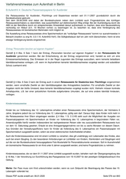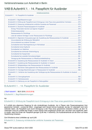 Verfahrenshinweise zum Aufenthalt in Berlin VAB B.AufenthV.1. - 14. Passpflicht für Ausländer Inhaltsverzeichnis B.AufenthV.1. - 14. Passpflicht für Ausländer ............................................................................................................ 575 ........................................................................................................................................................................... 575 B.AufenthV.1. Begriffsbestimmungen ................................................................................................................. 575 B.AufenthV.2. Erfüllung der Passpflicht durch Eintragung in den Pass eines gesetztlichen Vertreters .............. 575 B.AufenthV.3. Zulassung nichtdeutscher amtlicher Ausweise als Passersatz .................................................... 575 B.AufenthV.4. Deutsche Passersatzpapiere für Ausländer ................................................................................. 575 Eintrag "Personalien beruhen auf eigenen Angaben" .................................................................................. 576 Kinderreiseausweise .................................................................................................................................... 576 Reiseausweise für Flüchtlinge ..................................................................................................................... 577 Liste der weiteren Einträge in einen Reiseausweis für Flüchtlinge .............................................................. 577 B.AufenthV.5. Allgemeine Voraussetzungen der Ausstellung des Reiseausweises für Ausländer .................... 577 Unzumutbarkeit der Erfüllung der Wehrpflicht ............................................................................................. 578 Unzumutbarkeit aus anderen Gründen ........................................................................................................ 579 Zumutbarkeit einer Nachregistrierung im Heimatstaat ................................................................................. 579 Zumutbarkeit eines Kopftuchs ..................................................................................................................... 580 Zumutbarkeit von Gebühren ........................................................................................................................ 580 Zumutbarkeit bei drohender Strafverfolgung ............................................................................................... 580 Zumutbarkeit bei Asylgründen ..................................................................................................................... 580 Zumutbarkeit bei subsidiär Schutzberechtigten ........................................................................................... 581 Versagung des Reiseausweises zur Missbrauchsbekämpfung ................................................................... 581 B.AufenthV.6. Ausstellung des Reiseausweises für Ausländer im Inland ........................................................... 582 B.AufenthV.7. Ausstellung des Reiseausweises für Ausländer im Ausland ....................................................... 582 B.AufenthV.8. Gültigkeitsdauer des Reiseausweises für Ausländer ................................................................... 582 B.AufenthV.9. Räumlicher Geltungsbereich des Reiseausweises für Ausländer ............................................... 582 B.AufenthV.10. Sonstige Beschränkungen im Reiseausweis für Ausländer ....................................................... 583 B.AufenthV.11. Verfahren der Ausstellung oder Verlängerung des Reiseausweises für Ausländer im Ausland ...... 583 B.AufenthV.12. Grenzgängerkarte ...................................................................................................................... 583 B.AufenthV.13. Notreiseausweis ......................................................................................................................... 583 B.AufenthV.14. Befreiung von der Passpflicht im Rettungsfällen ....................................................................... 583 B.AufenthV.1. - 14. Passpflicht für Ausländer ( ÄndV AufenthV ; 08.01.2019; 20.03.2019) B.AufenthV.1. Begriffsbestimmungen frei B.AufenthV.2. Erfüllung der Passpflicht durch Eintragung in den Pass eines gesetztlichen Vertreters § 2 enthält eine allgemeine Regelung für alle minderjährigen Ausländer, die in Pässen oder Passersatzpapieren ihrer gesetzlichen Vertreter – zumeist der Eltern - eingetragen sind. Danach können Ausländer, die das 16. Lebensjahr noch nicht vollendet haben, die Passpflicht auch durch Eintragung in den Pass eines gesetzlichen Vertreters erfüllen; ab dem 10. Lebensjahr muss ein Lichtbild des Kindes in einen solchen Pass eingebracht worden sein. Die Eltern sind verpflichtet, dafür zu sorgen, dass ihre Kinder der Passpflicht genügen (§ 80 Abs. 4 AufenthG). Die Ausländerbehörde soll die Eltern auf diese Verpflichtung hinweisen. Zum Erfordernis eines Lichtbildes vgl. auch § 60. B.AufenthV.3. Zulassung nichtdeutscher amtlicher Ausweise als Passersatz frei Dieses PDF wurde erstellt am: 06.01.2020 Seite 575 von 843