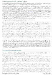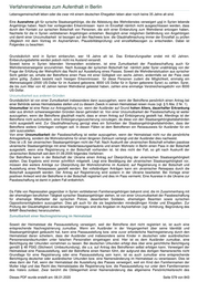 Verfahrenshinweise zum Aufenthalt in Berlin Lebensgemeinschaft leben oder die zwar mit einem deutschen Ehegatten leben aber noch keine 35 Jahre alt sind. Eine Ausnahme gilt für syrische Staatsangehörige, die die Ableistung des Wehrdienstes verweigert und in Syrien lebende Angehörige haben. Nach hier vorliegenden Erkenntnissen kann im Einzelfall nämlich nicht ausgeschlossen werden, dass durch den Kontakt zur syrischen Botschaft von Personen, die sich einer Einberufung zum Wehrdienst entzogen haben, Nachteile für die in Syrien verbliebenen Angehörigen entstehen. Bezüglich einer möglichen Gefährdung von Angehörigen und damit einer Unzumutbarkeit ist bezogen auf den Nachweis bzw. die Glaubhaftmachung immer der Einzelfall zu prüfen (Abgleich mit dem Vortrag im Asylverfahren, Plausibilitätsprüfung) und einzelfallbezogen zu entscheiden. Dabei ist Folgendes zu beachten: Grundsätzlich wird in Syrien einberufen, wer 18 Jahre alt ist. Das Einberufungsalter endet mit 42 Jahren. Einberufungsbefehle werden jedoch nicht ins Ausland versandt. Soweit keine in Syrien lebenden Verwandten existieren, ist eine Zumutbarkeit der Passbeschaffung auch für Wehrdienstverweigerer anzunehmen. Nach Aussage der syrischen Botschaft hat nämlich jeder Syrer unabhängig von der Frage der Erfüllung der Wehrpflicht das Recht auf Ausstellung eines Passes. Soweit die Wehrdienstsituation aus syrischer Sicht geklärt sei, erhalte der Betroffene einen Pass mit einer Gültigkeit von sechs Jahren, andernfalls sei der Pass zwei Jahre gültig. Zudem besteht nach hiesigen Erkenntnissen für diese Personen zudem die Möglichkeit, einmalig ein Wehrersatzgeld (2500 US-Dollar für im Ausland geborene, 8000 US Dollar für in Syrien geborene Syrer) zu zahlen. Syrer, die bis zum Alter von 42 Jahren keinen Wehrdienst geleistet haben, zahlen eine einmalige Verstreichensgebühr von 8000 US-Dollar. Unzumutbarkeit aus anderen Gründen Grundsätzlich ist von einer Zumutbarkeit insbesondere dann auszugehen, wenn der Betroffene persönlich einen Antrag bei einer Behörde seines Heimatstaates stellen und zu diesem Zweck in seinen Heimatstaat reisen muss (vgl. § 5 Abs. 2 Nr. 1). Unzumutbar ist eine Reise zur Antragstellung nur, wenn der Ausländer auf Grund hohen Alters, dauerhafter Erkrankung oder aus ähnlich schwerwiegenden Gründen daran gehindert ist. Von einer Unzumutbarkeit der Passbeschaffung ist weiter auszugehen, wenn der Betroffene glaubhaft macht, dass er einen Antrag auf Einbürgerung gestellt hat. Allerdings ist der Betroffene nicht aufzufordern, eine Einbürgerungszusicherung vorzulegen, da diese von den Staatsangehörigkeitsbehörden nicht ausgestellt wird. Zur Glaubhaftmachung genügt etwa ein Schreiben der Staatsangehörigkeitsbehörden, dass der Betroffene weitere Unterlagen vorlegen soll. In diesen Fällen ist dem Betroffenen ein Reiseausweis für Ausländer für ein Jahr auszustellen. Von einer Unzumutbarkeit der Passbeschaffung ist weiter auszugehen, wenn der Heimatstaat nicht nur die persönliche Antragstellung, sondern die Wohnsitznahme für einen längeren Zeitraum verlangt und der Ausländer dies nachweist. Dies ist z.B. bei ukrainischen Staatsangehörigen nicht der Fall. Nach Auskunft der ukrainischen Botschaft erhalten passlose ukrainische Staatsangehörige mit einer Niederlassungserlaubnis und einem Wohnsitz in Berlin einen Pass in der Botschaft ausgestellt, wenn eine Registrierung in der Botschaft vorhanden ist. Ist dies nicht der Fall, so gilt nach Auskunft der ukrainischen Botschaft seit dem 01.09.2005 folgendes Verfahren: Der Betroffene kann in der Botschaft der Ukraine einen Antrag auf Überprüfung der ukrainischen Staatsangehörigkeit stellen. Das Ergebnis wird immer schriftlich mitgeteilt. Liegt eine Bestätigung der ukrainischen Staatsangehörigkeit vor, müssen drei weitere Anträge zur Überprüfung der Wohnsitznahme im Ausland, auf Registrierung in der Botschaft und Ausstellung eines Reisepasses gestellt werden. Bei vollständigen Anträgen kann ein ukrainischer Reisepass durch die Botschaft ausgestellt werden. Der Antrag auf Registrierung wird sodann in der Ukraine bearbeitet. Bei Vorlage einer positiven Antwort wird der Betroffene in der Botschaft registriert und dies im Pass vermerkt. Eine Ausreise in die Ukraine zur Passbeschaffung ist damit in jedem Fall entbehrlich. Da Fälle von Repressalien gegenüber in Syrien verbliebenen Familienangehörigen bekannt sind, die im Zusammenhang mit der ehemaligen beruflichen Tätigkeit syrischer Staatsangehöriger stehen, ist von einer Unzumutbarkeit der Passbeschaffung für ehemalige Mitarbeiter der syrischen Polizei, desertierten Soldaten, ehemaligen Beamten sowie syrischen Oppositionsmitgliedern auszugehen. Dies gilt auch für die sie begleitenden minderjährigen Kinder und Ehegatten. Zur Prüfung der Glaubhaftigkeit eines derartigen Vortrages sind die Angaben im Asylverfahren (vgl. Anhörung, Begründung des BAMF-Bescheides) heranzuziehen. Zumutbarkeit einer Nachregistrierung im Heimatstaat Soweit der Heimatstaat die Passausstellung verweigert, weil der Betroffene dort nicht registriert ist, ist auch eine entsprechende Nachregistrierung zumutbar. Wenn ein Ausländer in der Vergangenheit über seine Identität und Staatsangehörigkeit getäuscht hat, kann eine Passausstellung bzw. eine zuvor erforderliche Nachregistrierung durch den Heimatstaat daran scheitern, dass der Ausländer und insbesondere seine Kinder in deutschen oder ausländischen Personenstandsurkunden unter falschen Personalien eingetragen sind. Hier ist es dem Ausländer zumutbar, eine Berichtigung der Urkunden vornehmen zu lassen. Bei deutschen Urkunden erfolgt dies über eine gerichtliche Berichtigung gemäß § 48 PStG (Stichwort: Umbeurkundung), die u.a. auf Antrag des Betroffenen selbst erfolgen kann. Verweigert der Heimatstaat eine Passausstellung, weil der Betroffene einen Namen führt, der aufgrund des dortigen Namensrechts nicht Grundlage für eine Registrierung oder eine Pa