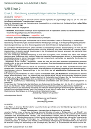Verfahrenshinweise zum Aufenthalt in Berlin zusätzlichen auflösenden Nebenbestimmung „Erlischt bei Zustimmung SenInnDS zur Rückführung“ verlängert. Merke: Bei Betroffenen, die zur Verlängerung ihrer Duldung vorsprechen und bei denen SenInnDS bereits zu einem Zeitpunkt vor der Änderung der Verfahrensweise zum 27.02.2019 die Zustimmung zur Abschiebung nicht erteilt hat, so dass die Auflage „Gültiges Reisedokument o. Nachweis über die Beantragung ist vorzulegen“ nicht verfügt worden ist, wird die Duldung zunächst entsprechend der vorstehenden Regelung mit den o.g. Nebenbestimmungen nach den o.g. Belehrungen und Hinweisen verlängert. Ggf. ist dann nach Ablauf der so verlängerten Duldung der Vorgang erneut vorzulegen. Dieses PDF wurde erstellt am: 06.01.2020 Seite 778 von 843