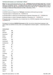 Verfahrenshinweise zum Aufenthalt in Berlin Merke: Eine erkennungsdienstliche Behandlung nach Art. 17 EURODAC-VO durch die Polizei erfolgt nicht. Im Regelfall werden zum Zeitpunkt der Festnahme eines illegal eingereisten Ausländers noch keine Anhaltspunkte vorliegen, die eine Übermittlung an EURODAC nach Art. 17 rechtfertigen. Es wird daher nur die ED-Behandlung nach § 49 Abs. 3, 5 bzw. 9 durchgeführt. Ergeben sich später Anhaltspunkte für das Vorliegen eines Falles des Art. 17 EURODAC-VO ist auf dieser Grundlage eine wiederholte ED-Behandlung durch die ABH zu veranlassen (s. Pkt 2.). EURODAC-Treffermeldung In EURODAC werden vier Kategorien bzw. Treffertypen unterschieden, die Kennzeichnung ist wie folgt: 1 Fingerabdruckdaten von Asylbewerbern (Art. 9 EURODAC-VO) 2 Fingerabdruckdaten von illegal über eine Dublinaußengrenze eingereisten Drittausländern (Art. 14 EURODAC-VO) 3 Fingerabdruckdaten von illegal im Dublingebiet aufgegriffenen Drittausländern (Art. 17 EURODAC-VO) 9 Fingerabdruckdaten von Drittausländern, die um Auskunft über ihre in EURODAC eingestellten Daten ersucht haben (Art. 29 EURODAC-VO) Die Kategorie ist innerhalb der EURODAC-Kennnummer die Ziffer, die nach dem Länderschlüssel eingetragen ist (die weiteren Stellen der EURODAC-Nummer werden von den Mitgliedstaaten individuell vergeben – in Deutschland durch das BKA -). Länderschlüssel Belgien BE Dänemark DK Deutschland DE Estland EE Finnland FI Frankreich FR Griechenland GR Großbritannien UK Irland IE Island IS Italien IT Lettland ' LV' Litauen LT Luxemburg LU Malta MT Niederlande NL Norwegen NO Österreich AT Polen PL Portugal PT Schweden SE Slowakei SK Slowenien SI Spanien ES Dieses PDF wurde erstellt am: 18.11.2020 Seite 388 von 884