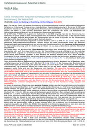 Verfahrenshinweise zum Aufenthalt in Berlin , dem Anerkennenden und anwesenden Zeugen unterschriebene Niederschrift zur Akte zu nehmen. 85a.2.1.2. Dasselbe gilt gemäß Nummer 2, wenn die Mutter des anzuerkennenden Kindes erklärt, ihre Zustimmung diene gezielt gerade einem im § 1597a Abs. 1 BGB genannten Zweck. 85a.2.1.3. Ist der Anerkennende in einem anderen Bundesland geboren, kann grundsätzlich eines Auskunftsersuchens gem. § 62 PStG an das Standesamt, welches den Geburtseintrag des Anerkennenden führt, gerichtet werden. In der Auskunft sind alle Kinder des Betroffenen aufgeführt. Von diesem Mittel kann insbesondere dann Gebrauch gemacht werden, wenn der Verdacht gegen den Anerkennenden besteht, dass er bereits mehrfach Kinder verschiedener ausländischer Mütter anerkannt hat und dieser Verdacht i.S.d. § 1597a Absatz 2 Satz 2 Nr. 4 BGB nicht anders als durch ein Auskunftsersuchen erhärtet oder auch entkräftet werden kann. Im formlosen Ersuchen ist auf ein berechtigtes behördliches Interesse hinzuweisen, da die Information über die Vaterschaft für weitere Kinder für das Verfahren nach § 85a benötigt wird. Hat ein Anerkennender bereits mehrfach die Anerkennung der Vaterschaft für Kinder verschiedener ausländischer Mütter erklärt, bei denen die rechtlichen Voraussetzungen für die erlaubte Einreise oder den erlaubten Aufenthalt jeweils nicht vorlagen, greift ...weggefallen...eine weitere Regelvermutung für eine missbräuchliche Vaterschaftsanerkennung. Das Tatbestandsmerkmal der mehrfachen Anerkennung ist nach dem Wortlaut der Vorschrift erst ab der dritten Anerkennung erfüllt. Weiteres Merkmal ist, dass die aktuelle Mutter zum Zeitpunkt der Anerkennung nicht im Besitz eines deutschen Aufenthaltstitels war. Des Weiteren muss die Anerkennung die rechtlichen Voraussetzungen für einen erlaubten Aufenthalt geschaffen haben. Dies ist in der Regel gegeben, wenn das Kind durch die Anerkennung die deutsche Staatsangehörigkeit erworben hat, da dann bereits die wesentlichen Erteilungsvoraussetzungen nach § 28 Abs. 1 S. 1 Nr. 3 für die Mutter vorliegen. Unerheblich ist dagegen, ob nach der Anerkennung tatsächlich ein Aufenthaltstitel erteilt wurde. Merke: Auch eine erste oder zweite Anerkennung kann zur Feststellung der missbräuchlichen Anerkennung führen. Es fehlt dann nur an der gesetzlichen Vermutung, so dass die Ausländerbehörde die volle Beweislast trägt. 85a.2.1.4. Der Tatbestand ist erfüllt, wenn dem Mann für die Abgabe seiner Vaterschaftsanerkennung Geld oder ein sonstiger Vermögensvorteil entweder versprochen oder gezahlt wurde. Gleiches gilt für die Frau, die der Anerkennung zugestimmt hat. Nach den vier Regelvermutungsgründen ist in der Anhörung gezielt zu fragen und die Antworten aktenkundig zu machen. Merke: Andere Konstellationen missbräuchlicher Vaterschaftsanerkennungen als die Vorgenannten sind nicht ausgeschlossen. Indizien hierfür können beispielsweise sein, dass keinerlei Hinweis auf eine tatsächliche Begegnung der Mutter mit dem Mann oder auf eine zwischen ihnen bestehende soziale oder emotionale Verbindung existiert. Allerdings liegt in diesen Fällen – wie zuvor beim Vaterschaftsanfechtungsverfahren – die volle Beweislast bei der Ausländerbehörde. Aus verwaltungspraktischen Gründen sind andere Konstellationen als die vier Regelvermutungen nur im Ausnahmefall näher zu prüfen. Neben den Regelvermutungen hat der Gesetzgeber als weitere Bedingung für eine missbräuchliche Vaterschaftsanerkennung formuliert, dass ohne die Anerkennung der Vaterschaft voraussichtlich keiner der Beteiligten in einen erlaubten Aufenthalt wachsen würde. Hierzu ist eine Prognose zum aufenthaltsrechtlichen Werdegang der Beteiligten erforderlich. Dabei ist die ausländische Staatsangehörigkeit der Mutter oder des Vaters zu Grunde zu legen. Ist die Mutter im Asylverfahren und hat keine gute Bleibeperspektive oder ist bereits ausreisepflichtig, kann sie voraussichtlich nicht eigenständig in einen erlaubten Aufenthalt wachsen. Gleiches gilt für das vaterlose Kind oder den kinderlosen ausländischen Vater. Würde das Kind nur durch die Anerkennung die deutsche Staatsangehörigkeit nach § 4 Abs. 1 oder 3 StAG oder einen Aufenthaltstitel erlangen, wäre der Tatbestand insgesamt erfüllt, da es dann auf aufenthaltsrechtliche Vorteile für die Mutter nicht mehr ankommt. Würde der ausländische Vater nur durch die Anerkennung einen Aufenthaltstitel, in der Regel nach § 25 Abs. 5 i.V.m. mit Art. 6 GG, erhalten, wäre der Tatbestand gleichfalls erfüllt. 85a.2.2. frei 85a.3.1. Ist der Feststellungsbescheid unanfechtbar geworden, besteht eine Mitteilungspflicht an die mitteilende Stelle und das beurkundende Standesamt am Wohnsitz der Mutter. Beide Stellen erhalten eine Abschrift des Feststellungsbescheides übersandt. Auf dem Feststellungsbescheid ist das Datum des Eintritts der Unanfechtbarkeit zu vermerken und zu siegeln. Eine Beglaubigung ist sodann entbehrlich. Ist eine Eintragung des Anerkennenden als Vater im Geburtenregister des Kindes bereits erfolgt, obwohl die Anerkennung nach §§ 1597a Absatz 3 Satz 1, 1598 Absatz 1 Satz 2 BGB unwirksam war, hat nach Unanfechtbarkeit des Bescheides der Ausländerbehörde eine Berichtigung nach § 48 PStG zu erfolgen. Die Berichtigung obliegt dem Standesamt bzw. dem zuständigen Familiengericht. Merke: Sind seit der fehlerhaften Eintragung zehn Jahre vergangen, so wird die fehlerhafte Anerkennung mit Wirkung ex tunc geheilt, d.h. die Vaterschaftsanerkennung gilt als von Anfang an wirksam vorgenommen, auch wenn sie gegen §§ 1597a Absatz 3 Satz 1, 1598 Absatz 1 Satz 2 BGB verstößt (§ 1598 Absatz 2 BGB). 2.1.3.2 BMI Rd.) 85a.3.2. Stellt die Ausländerbehörde das Verfahren gemäß Absatz 1 Satz 2 ein, teilt sie dieses der Mutter und dem Vater, der mitteilenden Stelle sowie dem Standesamt mit, damit letzteres die Beurkundung vornehmen kann, soweit keine anderen Beurkundungshindernisse vorliegen. Da die Einstellung