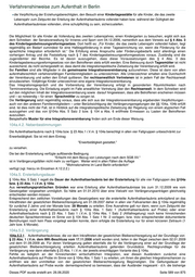 Verfahrenshinweise zum Aufenthalt in Berlin die Verpflichtung der Erziehungsberechtigten, den Besuch einer Kindertagesstätte für alle Kinder, die das zweite Lebensjahr zum Zeitpunkt der Erteilung der Aufenthaltserlaubnis vollendet haben bzw. während der Gültigkeit der Aufenthaltserlaubnisse vollenden, ohne schulpflichtig zu sein, sicherzustellen. Die Möglichkeit für alle Kinder ab Vollendung des zweiten Lebensjahres, einen Kindergarten zu besuchen, ergibt sich aus dem Schreiben der Senatsverwaltung für Inneres und Sport vom 04.12.2006, namentlich aus dem Verweis auf § 4 Abs. 3 des Kindertagesbetreuungsreformgesetzes. Dort heißt es: „Für Kinder, die das zweite Lebensjahr vollendet haben, liegt regelmäßig ein Bedarf zumindest für eine Halbtagsförderung in einer Tageseinrichtung vor, wenn die Förderung für die sprachliche Integration erforderlich ist.“ Die Erfüllung eines Anspruchs oder Förderungsbedarfs setzt allerdings einen vorherigen Antrag und die Feststellung nach § 7 des Kindertagesbetreuungsreformgesetzes voraus. Zuständig sind die Jugendämter der Bezirke. Es ist davon auszugehen, dass diese Voraussetzungen des § 4 Abs. 3 des Kindertagesbereuungsreformgesetzes von den Betroffenen stets erfüllt werden. Eine Betreuung durch Tagesmütter ist nicht ausreichend, da nicht sichergestellt ist, dass damit die integrationspolitische Zielsetzung der Vereinbarung erfüllt wird. Bei Familien sind alle Mitglieder in die gemeinsame Integrationsvereinbarung aufzunehmen. Diese ist dann von allen aufenthaltsrechtlich verfahrensfähigen Familienmitgliedern zu unterzeichnen. Alle Unterzeichner erhalten eine Durchschrift der Vereinbarung und sollen den Erhalt quittieren. Bei rechtsanwaltlich Vertretenen ist in jedem Fall der Rechtsanwalt einzubeziehen. Volljährige Kinder unterzeichnen eine eigene Integrationsvereinbarung. Das Integrationsgespräch und die Vorbereitung der Vereinbarung erfolgt in gesonderten Räumlichkeiten nach Terminvereinbarung. Die Einladung ergeht im Falle anwaltlicher Vertretung über den Rechtsanwalt. In dem Schreiben wird auf den möglichen Inhalt der Integrationsvereinbarung sowie darauf hingewiesen, dass alle Betroffenen erscheinen müssen und – so notwendig – für einen Sprachmittler zu sorgen ist. Die Verlängerung setzt regelmäßig voraus, dass alle sich aus der Integrationsvereinbarung ergebenden Verpflichtungen - auch von den anderen Familienmitgliedern – unter Berücksichtigung der Verlängerungsregelungen der §§ 104a, 104b erfüllt sind. Ist dies nicht der Fall, ist in Hinblick auf die integrationspolitische Zielsetzung der Regelung von einem atypischen Fall auszugehen und das von §104a Abs. 5 Satz 2 bzw. § 104 a Abs. 6 eröffnete Ermessen zu Lasten der Betroffenen auszuüben. Beispielhafte Muster für eine Integrationsvereinbarung finden sich am Ende dieser Weisung. 104a.4.2. Nebenbestimmungen Die Aufenthaltserlaubnis nach § 104a bzw. § 23 Abs.1 i.V.m. § 104a berechtigt in allen vier Fallgruppen unbeschränkt zur Erwerbstätigkeit. Sie ist mit dem Eintrag "Erwerbstätigkeit gestattet." zu versehen. Die bei der Ersterteilung verfügte auflösende Bedingung "Erlischt mit dem Bezug von Leistungen nach dem SGB XII." ist in Verlängerungsfällen nicht mehr zu verfügen. Weiter wird in allen Fällen die Auflage "Wohnsitznahme im Land Berlin erforderlich“ verfügt (vgl. hierzu im Einzelnen A.12.2.2.) 104a.5. Ersterteilungsdauer § 104a Abs. 5 Satz 1 regelt die Dauer der Aufenthaltserlaubnis bei der Ersterteilung für alle vier Fallgruppen des §104a bzw. § 23 Abs. 1 i.V.m. § 104a. Aus verwaltungspraktischen Gründen war eine Erteilung aller Aufenthaltserlaubnisse bis zum 31.12.2009 wie vom Gesetzgeber vorgesehen unmöglich. So hätte am 01.01.2010 über eine Vielzahl von Verlängerungsanträgen gleichzeitig entschieden werden müssen. Entsprechend den zeitlichen Vorstellungen des Gesetzgebers war die ersterteilte Aufenthaltserlaubnis anknüpfend an das Inkrafttreten der gesetzlichen Bleiberechtsregelung am 01.09.2007 daher in allen vier Fallvarianten des § 104a regelmäßig für zunächst 2 Jahre und vier Monate bzw. 28 Monate zu erteilen. Eine Ausnahme galt nur dann, wenn zum Zeitpunkt der Ersterteilung einer Aufenthaltserlaubnis nach § 104a Abs. 1 Satz 1 (Aufenthaltserlaubnis auf Probe) oder einer Aufenthaltserlaubnis nach § 23 Abs. 1 Satz 1 i.V.m. § 104a Abs. 1 Satz 2 (Altfallregelung) noch keine hinreichenden deutschen Sprachkenntnisse im Sinne von § 104 Abs. 1 Satz 1 Nr. 2 vorlagen, bzw. trotz entsprechender dokumentierte Bemühungen noch kein Pass vorgelegt werden konnte, dann erfolgte die Ersterteilung nur für einen kürzeren Zeitraum (1 Jahr bzw. 6 Monate). 104a.5.2. Verlängerung 104a.5.2.1 . Aufenthaltserlaubnisse, die vor dem Inkrafttreten der gesetzlichen Bleiberechtsregelung auf der Grundlage von § 23 Abs. 1 i.V.m. dem IMK-Beschluss vom 17.11.2006 erteilt worden sind, liefen in der Regel zwischen dem 02.01.2009 und dem 01.09.2009 ab. Für deren Verlängerung galten ebenfalls die für die Verlängerung einer auf der Grundlage der gesetzlichen Bleiberechtsregelung erteilten Aufenthaltserlaubnis geltenden Grundsätze. Rechtsgrundlage für die Verlängerung war dann ebenfalls § 23 Abs. 1 i.V.m. der jeweils einschlägigen Variante des § 104a. Fehlte es lediglich an der hinreichenden wirtschaftlichen Integration, war diesen Ausländern zunächst eine Aufenthaltserlaubnis auf Probe im Sinne von § 104a Abs. 1 Satz 1 zu erteilen, um ihnen die gleichen Integrationschancen zu eröffnen wie den unmittelbar von der gesetzlichen Bleiberechtsregelung Begünstigten. Die Geltungsdauer der Aufenthaltserlaubnis auf Probe wurde dementsprechend so bemessen, dass der Ausländer insgesamt - d.h. die bisherige Dieses PDF wurde erstellt am: 26.06.2020 Seite 589 von 875
