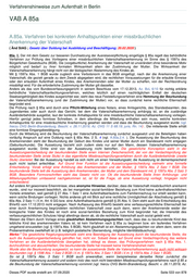 Verfahrenshinweise zum Aufenthalt in Berlin , dem Anerkennenden und anwesenden Zeugen unterschriebene Niederschrift zur Akte zu nehmen. 85a.2.1.2. Dasselbe gilt gemäß Nummer 2, wenn die Mutter des anzuerkennenden Kindes erklärt, ihre Zustimmung diene gezielt gerade einem im § 1597a Abs. 1 BGB genannten Zweck. 85a.2.1.3. Ist der Anerkennende in einem anderen Bundesland geboren, kann grundsätzlich eines Auskunftsersuchens gem. § 62 PStG an das Standesamt, welches den Geburtseintrag des Anerkennenden führt, gerichtet werden. In der Auskunft sind alle Kinder des Betroffenen aufgeführt. Von diesem Mittel kann insbesondere dann Gebrauch gemacht werden, wenn der Verdacht gegen den Anerkennenden besteht, dass er bereits mehrfach Kinder verschiedener ausländischer Mütter anerkannt hat und dieser Verdacht i.S.d. § 1597a Absatz 2 Satz 2 Nr. 4 BGB nicht anders als durch ein Auskunftsersuchen erhärtet oder auch entkräftet werden kann. Im formlosen Ersuchen ist auf ein berechtigtes behördliches Interesse hinzuweisen, da die Information über die Vaterschaft für weitere Kinder für das Verfahren nach § 85a benötigt wird. Hat ein Anerkennender bereits mehrfach die Anerkennung der Vaterschaft für Kinder verschiedener ausländischer Mütter erklärt, bei denen die rechtlichen Voraussetzungen für die erlaubte Einreise oder den erlaubten Aufenthalt jeweils nicht vorlagen, greift ...weggefallen...eine weitere Regelvermutung für eine missbräuchliche Vaterschaftsanerkennung. Das Tatbestandsmerkmal der mehrfachen Anerkennung ist nach dem Wortlaut der Vorschrift erst ab der dritten Anerkennung erfüllt. Weiteres Merkmal ist, dass die aktuelle Mutter zum Zeitpunkt der Anerkennung nicht im Besitz eines deutschen Aufenthaltstitels war. Des Weiteren muss die Anerkennung die rechtlichen Voraussetzungen für einen erlaubten Aufenthalt geschaffen haben. Dies ist in der Regel gegeben, wenn das Kind durch die Anerkennung die deutsche Staatsangehörigkeit erworben hat, da dann bereits die wesentlichen Erteilungsvoraussetzungen nach § 28 Abs. 1 S. 1 Nr. 3 für die Mutter vorliegen. Unerheblich ist dagegen, ob nach der Anerkennung tatsächlich ein Aufenthaltstitel erteilt wurde. Merke: Auch eine erste oder zweite Anerkennung kann zur Feststellung der missbräuchlichen Anerkennung führen. Es fehlt dann nur an der gesetzlichen Vermutung, so dass die Ausländerbehörde die volle Beweislast trägt. 85a.2.1.4. Der Tatbestand ist erfüllt, wenn dem Mann für die Abgabe seiner Vaterschaftsanerkennung Geld oder ein sonstiger Vermögensvorteil entweder versprochen oder gezahlt wurde. Gleiches gilt für die Frau, die der Anerkennung zugestimmt hat. Nach den vier Regelvermutungsgründen ist in der Anhörung gezielt zu fragen und die Antworten aktenkundig zu machen. Merke: Andere Konstellationen missbräuchlicher Vaterschaftsanerkennungen als die Vorgenannten sind nicht ausgeschlossen. Indizien hierfür können beispielsweise sein, dass keinerlei Hinweis auf eine tatsächliche Begegnung der Mutter mit dem Mann oder auf eine zwischen ihnen bestehende soziale oder emotionale Verbindung existiert. Allerdings liegt in diesen Fällen – wie zuvor beim Vaterschaftsanfechtungsverfahren – die volle Beweislast bei der Ausländerbehörde. Aus verwaltungspraktischen Gründen sind andere Konstellationen als die vier Regelvermutungen nur im Ausnahmefall näher zu prüfen. Neben den Regelvermutungen hat der Gesetzgeber als weitere Bedingung für eine missbräuchliche Vaterschaftsanerkennung formuliert, dass ohne die Anerkennung der Vaterschaft voraussichtlich keiner der Beteiligten in einen erlaubten Aufenthalt wachsen würde. Hierzu ist eine Prognose zum aufenthaltsrechtlichen Werdegang der Beteiligten erforderlich. Dabei ist die ausländische Staatsangehörigkeit der Mutter oder des Vaters zu Grunde zu legen. Ist die Mutter im Asylverfahren und hat keine gute Bleibeperspektive oder ist bereits ausreisepflichtig, kann sie voraussichtlich nicht eigenständig in einen erlaubten Aufenthalt wachsen. Gleiches gilt für das vaterlose Kind oder den kinderlosen ausländischen Vater. Würde das Kind nur durch die Anerkennung die deutsche Staatsangehörigkeit nach § 4 Abs. 1 oder 3 StAG oder einen Aufenthaltstitel erlangen, wäre der Tatbestand insgesamt erfüllt, da es dann auf aufenthaltsrechtliche Vorteile für die Mutter nicht mehr ankommt. Würde der ausländische Vater nur durch die Anerkennung einen Aufenthaltstitel, in der Regel nach § 25 Abs. 5 i.V.m. mit Art. 6 GG, erhalten, wäre der Tatbestand gleichfalls erfüllt. 85a.2.2. frei 85a.3.1. Ist der Feststellungsbescheid unanfechtbar geworden, besteht eine Mitteilungspflicht an die mitteilende Stelle und das beurkundende Standesamt am Wohnsitz der Mutter. Beide Stellen erhalten eine Abschrift des Feststellungsbescheides übersandt. Auf dem Feststellungsbescheid ist das Datum des Eintritts der Unanfechtbarkeit zu vermerken und zu siegeln. Eine Beglaubigung ist sodann entbehrlich. Ist eine Eintragung des Anerkennenden als Vater im Geburtenregister des Kindes bereits erfolgt, obwohl die Anerkennung nach §§ 1597a Absatz 3 Satz 1, 1598 Absatz 1 Satz 2 BGB unwirksam war, hat nach Unanfechtbarkeit des Bescheides der Ausländerbehörde eine Berichtigung nach § 48 PStG zu erfolgen. Die Berichtigung obliegt dem Standesamt bzw. dem zuständigen Familiengericht. Merke: Sind seit der fehlerhaften Eintragung zehn Jahre vergangen, so wird die fehlerhafte Anerkennung mit Wirkung ex tunc geheilt, d.h. die Vaterschaftsanerkennung gilt als von Anfang an wirksam vorgenommen, auch wenn sie gegen §§ 1597a Absatz 3 Satz 1, 1598 Absatz 1 Satz 2 BGB verstößt (§ 1598 Absatz 2 BGB). 2.1.3.2 BMI Rd.) 85a.3.2. Stellt die Ausländerbehörde das Verfahren gemäß Absatz 1 Satz 2 ein, teilt sie dieses der Mutter und dem Vater, der mitteilenden Stelle sowie dem Standesamt mit, damit letzteres die Beurkundung vornehmen kann, soweit keine anderen Beurkundungshindernisse vorliegen. Da die Einstellung