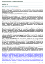 Verfahrenshinweise zum Aufenthalt in Berlin VAB A 47a A.47a. Mitwirkungspflichten; Lichtbildabgleich ( 14.06.2017 ) 47a.0. Legt eine vollverschleierte Ausländerin zur Identifizierung ein Personaldokument vor, hat sie den Lichtbildabgleich zu ermöglichen, indem sie die Gesichtsverhüllung ablegt. Dies gilt für den Lichtbildabgleich mit einem Pass, einem Passersatz, einem Ausweisersatz, einer Aufenthaltsgestattung, eines Ankunftsnachweises, eines Aufenthaltstitels und einer Duldung. Einem Wunsch der Betroffenen, den Gesichtsschleier vor einer weiblichen Beschäftigten abzulegen, kann entsprochen werden, so dadurch der Zweck der Maßnahme nicht gefährdet wird und dienstliche Gründe nicht entgegen stehen. Wer den Lichtbildabgleich verweigert, handelt ordnungswidrig, vgl. § 98 Abs. 2 Nr. 2a AufenthG, und verletzt auch seine Mitwirkungspflicht (vgl. § 82 Abs.1 S. 1 letzte Alt. i.V.m. § 5 Abs. 1 Nr. 1a). Letzteres kann die Versagung eines Aufenthaltstitels nach sich ziehen. 47a.1. - 3. frei Dieses PDF wurde erstellt am: 17.06.2020 Seite 372 von 875