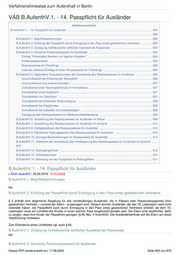 Verfahrenshinweise zum Aufenthalt in Berlin VAB B.AufenthV.1. - 14. Passpflicht für Ausländer Inhaltsverzeichnis B.AufenthV.1. - 14. Passpflicht für Ausländer ............................................................................................................ 603 ............................................................................................................................................................................. 686 B.AufenthV.1. Begriffsbestimmungen ................................................................................................................. 603 B.AufenthV.2. Erfüllung der Passpflicht durch Eintragung in den Pass eines gesetztlichen Vertreters .............. 603 B.AufenthV.3. Zulassung nichtdeutscher amtlicher Ausweise als Passersatz .................................................... 603 B.AufenthV.4. Deutsche Passersatzpapiere für Ausländer ................................................................................. 603 Eintrag "Personalien beruhen auf eigenen Angaben" .................................................................................. 604 Kinderreiseausweise .................................................................................................................................... 604 Reiseausweise für Flüchtlinge ..................................................................................................................... 605 Liste der weiteren Einträge in einen Reiseausweis für Flüchtlinge .............................................................. 605 B.AufenthV.5. Allgemeine Voraussetzungen der Ausstellung des Reiseausweises für Ausländer .................... 605 Unzumutbarkeit der Erfüllung der Wehrpflicht ............................................................................................. 606 Unzumutbarkeit aus anderen Gründen ........................................................................................................ 607 Zumutbarkeit einer Nachregistrierung im Heimatstaat ................................................................................. 607 Zumutbarkeit eines Kopftuchs ..................................................................................................................... 607 Zumutbarkeit von Gebühren ........................................................................................................................ 607 Zumutbarkeit bei drohender Strafverfolgung ............................................................................................... 608 Zumutbarkeit bei Asylgründen ..................................................................................................................... 608 Zumutbarkeit bei subsidiär Schutzberechtigten ........................................................................................... 609 Versagung des Reiseausweises zur Missbrauchsbekämpfung ................................................................... 609 B.AufenthV.6. Ausstellung des Reiseausweises für Ausländer im Inland ........................................................... 609 B.AufenthV.7. Ausstellung des Reiseausweises für Ausländer im Ausland ....................................................... 610 B.AufenthV.8. Gültigkeitsdauer des Reiseausweises für Ausländer ................................................................... 610 B.AufenthV.9. Räumlicher Geltungsbereich des Reiseausweises für Ausländer ............................................... 610 B.AufenthV.10. Sonstige Beschränkungen im Reiseausweis für Ausländer ....................................................... 610 B.AufenthV.11. Verfahren der Ausstellung oder Verlängerung des Reiseausweises für Ausländer im Ausland ...... 610 B.AufenthV.12. Grenzgängerkarte ...................................................................................................................... 610 B.AufenthV.13. Notreiseausweis ......................................................................................................................... 610 B.AufenthV.14. Befreiung von der Passpflicht im Rettungsfällen ....................................................................... 611 B.AufenthV.1. - 14. Passpflicht für Ausländer ( ÄndV AufenthV ; 20.03.2019; 10.03.2020) B.AufenthV.1. Begriffsbestimmungen frei B.AufenthV.2. Erfüllung der Passpflicht durch Eintragung in den Pass eines gesetztlichen Vertreters § 2 enthält eine allgemeine Regelung für alle minderjährigen Ausländer, die in Pässen oder Passersatzpapieren ihrer gesetzlichen Vertreter – zumeist der Eltern - eingetragen sind. Danach können Ausländer, die das 16. Lebensjahr noch nicht vollendet haben, die Passpflicht auch durch Eintragung in den Pass eines gesetzlichen Vertreters erfüllen; ab dem 10. Lebensjahr muss ein Lichtbild des Kindes in einen solchen Pass eingebracht worden sein. Die Eltern sind verpflichtet, dafür zu sorgen, dass ihre Kinder der Passpflicht genügen (§ 80 Abs. 4 AufenthG). Die Ausländerbehörde soll die Eltern auf diese Verpflichtung hinweisen. Zum Erfordernis eines Lichtbildes vgl. auch § 60. B.AufenthV.3. Zulassung nichtdeutscher amtlicher Ausweise als Passersatz frei B.AufenthV.4. Deutsche Passersatzpapiere für Ausländer Dieses PDF wurde erstellt am: 17.06.2020 Seite 603 von 875