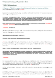 Verfahrenshinweise zum Aufenthalt in Berlin VAB E Afghanistan 1 E.Afghan.1. Rückführung ausreisepflichtiger afghanischer Staatsangehöriger ( 19.07.2019; VAB-Kommission 2018/19; 17.03.2020 ) Derzeit liegt keine einheitliche Beschlusslage der ständigen Konferenz der Innenminister und -senatoren der Länder zu Rückführungen nach Afghanistan vor. Grundsätzlich vorrangiges Ziel vor einer Rückführung ist weiterhin die freiwillige Rückkehr. Den zur Rückkehr verpflichteten afghanischen Staatsangehörigen soll regelmäßig eine angemessene Frist eingeräumt werden, innerhalb derer sie ihre freiwillige Ausreise vorbereiten und ggf. unter Inanspruchnahme vorhandener Möglichkeiten der Rückkehrberatung, -förderung oder sonstiger rückkehrbegleitender Maßnahmen organisieren und durchführen können. Liegen die Voraussetzungen zur Durchsetzung der Ausreisepflicht vor, erfolgt durch die Ausländerbehörde ausschließlich in ...weggefallen... den folgenden Fällen eine Zustimmungsvorlage. ...weggefallen... Vorgänge von • Straftätern, wobei Strafen von weniger als 50 Tagessätzen bzw. 90 Tagessätzen (additiv) nach aufenthaltsrechtlichen Vorschriften (Bagatellgrenze) außer Betracht bleiben, • aufenthaltsrechtlichen Gefährdern ...weggefallen ... • Personen, die sich hartnäckig der Identitätsfeststellung verweigern, sind unter Beifügung/Übermittlung der Ausländerakte und mit einem Anschreiben, in dem um Zustimmung zur beabsichtigten Abschiebung unter Darstellung des ausländerrechtlichen Werdeganges sowie ggf. in der Vergangenheit geltend gemachter Abschiebungshindernisse und deren Bewertung gebeten wird, SenInnDS über die Referats leitung zu übersenden. Liegen im Einzelfall besondere Umstände vor, ist auf diese im Rahmen der Vorlage hinzuweisen. Als „hartnäckige“ Identitätsverweigerer gelten vollziehbar ausreisepflichtige afghanische Staatsangehörige, die mehr als zwei Identitäten benutzt oder mehrfach getäuscht haben und eine Aufklärung nicht selbst veranlasst bzw. unterstützt haben. Aliasidentitäten, die lediglich geringe Abweichungen in der Schreibweise des Namens, ansonsten aber identische Daten aufweisen, bleiben unberücksichtigt. ...weggefallen... Eine Vorlage ist entbehrlich in Fällen, in denen ein Ersuchen nach § 23a AufenthG mit der erforderlichen Mehrheit gestellt, eine Entscheidung nach § 23a AufenthG aber nicht getroffen wurde. Hier lag der Vorgang dem Senator für Inneres und Sport vor, so dass eine erneute Vorlage entbehrlich ist. Vorbehaltlich des Vorliegens der o.g. Abschiebungskriterien gilt die Zustimmung zur Abschiebung dann grundsätzlich für die folgenden 1 8 Monate als erteilt. Im Falle der Zustimmung zur Abschiebung ist SenInnDS anschließend über den genauen Abschiebungstermin zu unterrichten. SenInnDS ist ebenfalls zu unterrichten über bevorstehende Rückführungstermine im Rahmen des DÜ (im Wege der Vollzugshilfe für das BAMF) und bei Abschiebungen in Staaten außerhalb Afghanistans (in eigener Zuständigkeit des Landes Berlin), die zur Aufnahme des Ausländers verpflichtet oder dazu bereit sind. Die entsprechende Information ist an R Dieses PDF wurde erstellt am: 17.06.2020 Seite 795 von 875