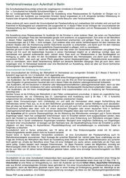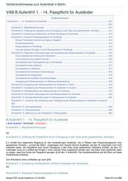 Verfahrenshinweise zum Aufenthalt in Berlin VAB B.AufenthV.1. - 14. Passpflicht für Ausländer Inhaltsverzeichnis B.AufenthV.1. - 14. Passpflicht für Ausländer ............................................................................................................ 613 ............................................................................................................................................................................. 697 B.AufenthV.1. Begriffsbestimmungen ................................................................................................................. 613 B.AufenthV.2. Erfüllung der Passpflicht durch Eintragung in den Pass eines gesetztlichen Vertreters .............. 613 B.AufenthV.3. Zulassung nichtdeutscher amtlicher Ausweise als Passersatz .................................................... 613 B.AufenthV.4. Deutsche Passersatzpapiere für Ausländer ................................................................................. 613 Eintrag "Personalien beruhen auf eigenen Angaben" .................................................................................. 614 Kinderreiseausweise .................................................................................................................................... 614 Reiseausweise für Flüchtlinge ..................................................................................................................... 614 Liste der weiteren Einträge in einen Reiseausweis für Flüchtlinge .............................................................. 615 B.AufenthV.5. Allgemeine Voraussetzungen der Ausstellung des Reiseausweises für Ausländer .................... 615 Unzumutbarkeit der Erfüllung der Wehrpflicht ............................................................................................. 616 Unzumutbarkeit aus anderen Gründen ........................................................................................................ 616 Zumutbarkeit einer Nachregistrierung im Heimatstaat ................................................................................. 617 Zumutbarkeit eines Kopftuchs ..................................................................................................................... 617 Zumutbarkeit von Gebühren ........................................................................................................................ 617 Zumutbarkeit bei drohender Strafverfolgung ............................................................................................... 618 Zumutbarkeit bei Asylgründen ..................................................................................................................... 618 Zumutbarkeit bei subsidiär Schutzberechtigten ........................................................................................... 618 Versagung des Reiseausweises zur Missbrauchsbekämpfung ................................................................... 619 B.AufenthV.6. Ausstellung des Reiseausweises für Ausländer im Inland ........................................................... 619 B.AufenthV.7. Ausstellung des Reiseausweises für Ausländer im Ausland ....................................................... 619 B.AufenthV.8. Gültigkeitsdauer des Reiseausweises für Ausländer ................................................................... 619 B.AufenthV.9. Räumlicher Geltungsbereich des Reiseausweises für Ausländer ............................................... 620 B.AufenthV.10. Sonstige Beschränkungen im Reiseausweis für Ausländer ....................................................... 620 B.AufenthV.11. Verfahren der Ausstellung oder Verlängerung des Reiseausweises für Ausländer im Ausland ...... 620 B.AufenthV.12. Grenzgängerkarte ...................................................................................................................... 620 B.AufenthV.13. Notreiseausweis ......................................................................................................................... 620 B.AufenthV.14. Befreiung von der Passpflicht im Rettungsfällen ....................................................................... 620 B.AufenthV.1. - 14. Passpflicht für Ausländer ( ÄndV AufenthV ; 04.03.2021; 18.03.2021 ) B.AufenthV.1. Begriffsbestimmungen frei B.AufenthV.2. Erfüllung der Passpflicht durch Eintragung in den Pass eines gesetztlichen Vertreters § 2 enthält eine allgemeine Regelung für alle minderjährigen Ausländer, die in Pässen oder Passersatzpapieren ihrer gesetzlichen Vertreter – zumeist der Eltern - eingetragen sind. Danach können Ausländer, die das 16. Lebensjahr noch nicht vollendet haben, die Passpflicht auch durch Eintragung in den Pass eines gesetzlichen Vertreters erfüllen; ab dem 10. Lebensjahr muss ein Lichtbild des Kindes in einen solchen Pass eingebracht worden sein. Die Eltern sind verpflichtet, dafür zu sorgen, dass ihre Kinder der Passpflicht genügen (§ 80 Abs. 4 AufenthG). Die Ausländerbehörde soll die Eltern auf diese Verpflichtung hinweisen. Zum Erfordernis eines Lichtbildes vgl. auch § 60. B.AufenthV.3. Zulassung nichtdeutscher amtlicher Ausweise als Passersatz frei B.AufenthV.4. Deutsche Passersatzpapiere für Ausländer Dieses PDF wurde erstellt am: 21.04.2021 Seite 613 von 886