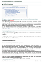 Verfahrenshinweise zum Aufenthalt in Berlin VAB E Afghanistan 1 Inhaltsverzeichnis E.Afghan.1. Rückführung ausreisepflichtiger afghanischer Staatsangehöriger ...... 807 I. Zustimmungsvorlage an SenInnDS ........................................................ 818 1. Zustimmungsvorlage in den folgenden Fällen: ............................... 818 2. Zustimmung zur Abschiebung wird erteilt ...................................... 819 3. Zustimmung zur Abschiebung wird nicht erteilt .............................. 819 4. Erneute Vorlage zur Zustimmung ................................................... 819 II. keine Zustimmungsvorlage an SenInnDS ............................................. 820 II.1. (Erst-)Erteilung der Duldung ........................................................ 808 II. 2. Verlängerung der Duldung ......................................................... 808 E.Afghan.1. Rückführung ausreisepflichtiger afghanischer Staatsangehöriger (22.10.2020; 23.11.2020; 18.03.2021 ) Derzeit liegt keine einheitliche Beschlusslage der ständigen Konferenz der Innenminister und -senatoren der Länder zu Rückführungen nach Afghanistan vor. Grundsätzlich vorrangiges Ziel vor einer Rückführung ist weiterhin die freiwillige Rückkehr. Den zur Rückkehr verpflichteten afghanischen Staatsangehörigen soll regelmäßig eine angemessene Frist eingeräumt werden, innerhalb derer sie ihre freiwillige Ausreise vorbereiten und ggf. unter Inanspruchnahme vorhandener Möglichkeiten der Rückkehrberatung, -förderung oder sonstiger rückkehrbegleitender Maßnahmen organisieren und durchführen können. Erst wenn sämtliche Voraussetzungen zur Durchsetzung der Ausreisepflicht vorliegen, ist zu prüfen, ob der Vorgang SenInnDS mit der Bitte um Zustimmung zur Abschiebung vorzulegen ist oder nicht. Im Umkehrschluss ist deshalb bei Ersterteilung der Duldung zunächst eine „Belehrungsduldung“ für 6 Monate nach § 60 a Abs. 2 S. 1 bei Passlosigkeit zu erteilen (vgl. VAB.A.60b). I. Zustimmungsvorlage an SenInnDS 1. Zustimmungsvorlage in den folgenden Fällen: Liegen die Voraussetzungen zur Durchsetzung der Ausreisepflicht vor, erfolgt durch die Ausländerbehörde ausschließlich in den folgenden Fällen eine Zustimmungsvorlage. Vorgänge von • Straftätern, wobei Strafen von weniger als 50 Tagessätzen bzw. 90 Tagessätzen (additiv) nach aufenthaltsrechtlichen Vorschriften (Bagatellgrenze) außer Betracht bleiben, • aufenthaltsrechtlichen Gefährdern und • Personen, die sich hartnäckig der Identitätsfeststellung verweigern, sind unter Beifügung/Übermittlung der Ausländerakte und mit einem Anschreiben, in dem um Zustimmung zur beabsichtigten Abschiebung unter Darstellung des ausländerrechtlichen Werdeganges sowie ggf. in der Vergangenheit geltend gemachter Abschiebungshindernisse und deren Bewertung gebeten wird, SenInnDS über die Referatsleitung zu übersenden. Vor der Vorlage an SenInnDS ist zu prüfen, ob der vollziehbar Ausreisepflichtige Opfer einer Gewaltstraftat im Zusammenhang mit Hasskriminalität mit erheblichen Folgen geworden ist und unter die Weisung A.60a.2.2. fällt. Das Prüfergebnis ist stets - auch bei negativem Befund – in dem Schreiben an SenInnDS zu vermerken. Liegen im Einzelfall weitere besondere Umstände vor, ist auf diese im Rahmen der Vorlage hinzuweisen. Als „hartnäckige“ Identitätsverweigerer gelten vollziehbar grundsätzlich ausreisepflichtige afghanische Staatsangehörige, die mehr als zwei Identitäten benutzt oder mehrfach getäuscht haben und eine Aufklärung nicht selbst veranlasst bzw. unterstützt haben. Aliasidentitäten, die lediglich geringe Abweichungen in der Schreibweise des Namens, ansonsten aber identische Daten aufweisen, bleiben unberücksichtigt. Für die Dauer der Prüfung erhalten die Betroffenen eine Duldung auf der Grundlage des § 60a Abs. 2 S. 1 AufenthG für die Dauer von drei Monaten mit der auflösenden Nebenbestimmung „Erlischt bei Zustimmung SenInnDS zur Rückführung“. 2. Zustimmung zur Abschiebung wird erteilt Dieses PDF wurde erstellt am: 21.04.2021 Seite 807 von 886