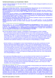 Verfahrenshinweise zum Aufenthalt in Berlin Straftat erfolgte, ergibt sich dies stets aus der Bezeichnung des Straftatbestandes im Urteil oder BZR-Auszug (bspw. Straftatbestand der "Fahrlässigen Tötung"). Soweit nach der gesetzlichen Regelung Geldstrafen bis zu 50 bzw. 90 Tagessätzen außer Betracht bleiben, sind mehrere Geldstrafen kumulativ zu betrachten. Dies ergibt sich aus dem Wort „insgesamt“. Auch hierbei ist jedoch zwischen den Geldstrafen für Straftaten, die von allen und Straftaten die nur von Ausländern begangen werden können, zu trennen. (Beispiel: einfacher Ladendiebstahl und fahrlässige Körperverletzung sind kumulativ zu betrachten; einfacher Ladendiebstahl und unerlaubte Einreise entgegen eines Einreise- und Aufenthaltsverbots dagegen nicht.) Verurteilungen, die bereits einem Verwertungsverbot gemäß § 51 BZRG unterliegen, bleiben ebenfalls außer Betracht. 19d.2.1. Verlängerung der Aufenthaltserlaubnis ohne Beteiligung der Bundesagentur Hat der Ausländer mit einer Aufenthaltserlaubnis nach § 19d Abs. 1 oder Abs. 1a seit zwei Jahren eine der (erworbenen) beruflichen Qualifikation entsprechende Beschäftigung ausgeübt, kann die Aufenthaltserlaubnis nunmehr für jede Beschäftigung verlängert werden (§ 9 Abs. 1 Nr. 1 BeschV). Die Entscheidung über die Verlängerung erfolgt ohne Beteiligung der Bundesagentur für Arbeit, vgl § 9 Abs. 1 Nr. 1 BeschV. Voraussetzung ist neben den allgemeinen Erteilungsvoraussetzungen nur, dass der Ausländer – in welcher Art auch immer - weiter beschäftigt ist. Anderenfalls kommt eine Verlängerung aufgrund des Wegfalls des Aufenthaltszwecks nicht in Betracht. 19d.2.2. Nebenbestimmungen Die Aufenthaltserlaubnis nach § 19d enthält bei der Ersterteilung grundsätzlich den folgenden Eintrag zur Erwerbstätigkeit: „Beschäftigung nicht erlaubt mit Ausnahme der Tätigkeit als… bei… Selbstständige Tätigkeit nicht erlaubt.“ Das Verbot der selbständigen Erwerbstätigkeit bis zur Erfüllung der Voraussetzungen des § 19d Abs. 2 trägt dem in dieser Vorschrift zum Ausdruck kommenden gesetzgeberischen Interesse Rechnung, dass der Ausländer die qualifizierte Beschäftigung, die ihm zur AE verholfen hat, auch mindestens zwei Jahre ausübt. Selbstständige Tätigkeiten im besonderen öffentlichen Interesse können während dieses Zeitraumes erlaubt werden (vgl. dazu A.21.6.). Liegen die Voraussetzungen des § 19d Abs. 2 vor, enthält die Aufenthaltserlaubnis den Eintrag: „Erwerbstätigkeit erlaubt.“ Beachte: Die Erlaubnis selbstständiger Tätigkeit (vgl. A.21.6.) kann in den Fällen des § 19d nur dazu dienen, die Möglichkeit eines Zuverdienst es neben der Beschäftigung zu eröffnen. Bei ausschließlich selbstständiger Tätigkeit kommt eine Aufenthaltserlaubnis zum Zwecke der Beschäftigung nicht in Betracht, hier muss der Antragsteller die Voraussetzungen nach § 21 erfüllen. 19d.3. Sperrwirkung des § 10 Abs. 3 Von der Sperrwirkung des § 10 Abs. 3 Satz 1 kann gemäß § 19d Abs. 3 abgesehen werden. In diesem Fall ist das entsprechende Ermessen im Interesse der gesetzgeberischen Zielsetzung ebenfalls zu Gunsten der Betroffenen auszuüben. Wurde der Asylantrag nach § 30 Abs. 3 Nr. 1 bis 6 AsylG als offensichtlich unbegründet abgelehnt, kommt wegen der Sperrwirkung des § 10 Abs. 3 Satz 2 nur eine Aufenthaltserlaubnis nach § 19d Abs. 1a in Betracht, da insoweit ein Anspruch besteht, vgl. § 10 Abs. 3 Satz 3. Gemäß § 19d Abs. 3 kann von den Regelerteilungsvoraussetzungen des § 5 Abs. 2 abgesehen werden. Das entsprechende Ermessen ist im Interesse der gesetzgeberischen Zielsetzung jedoch regelmäßig zu Gunsten der Betroffenen auszuüben. Dieses PDF wurde erstellt am: 21.05.2021 Seite 203 von 899