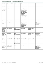 Verfahrenshinweise zum Aufenthalt in Berlin Australien gültiger australischer nicht benannt* 3 Monate (GMBl. 1953 Pass S. 575) Brasilien gültiger Nationalpass Befreiung von der BGBl. 2008 II Visumpflicht für S. 1179 Kurzaufenthalte von 3 Monaten auch dann, wenn sie sich länger als drei Monate im Hoheitsgebiet der Bundesrepublik Deutschland aufhalten wollen. Chile gültiger chilenischer nicht benannt* 90 Tage; für Einreiseverbot (GMBl. 1955 Nationalpass diplomatische und gegenüber S. 22) konsularische unerwünschten Berufsbeamte bis Personen zum Ende ihres Auftrages El Salvador nicht aufgeführt keine nicht geregelt *** spätestens nach 3 (BAnz. Nr. Erwerbstätigkeit Monaten 160 vom 28.08.98) Honduras Nationalpass keine nicht geregelt *** spätestens nach 3 Einreiseverbot (GMBl. 1963 Erwerbstätigkeit* Monaten gegenüber S. 363) unerwünschten Personen Japan Nationalpass*** Studium, Besuch nicht geregelt*** spätestens nach 3 (BAnz. Nr. von Angehörigen, Monaten 160 vom sowie nicht auf 28.08.98) Gelderwerb gerichtete Zwecke Kanada gültiger Pass des Besuch* 3 Monate Einreiseverbot (GMBl. 1953 Heimatstaates gegenüber S. 575) unerwünschten Personen Dieses PDF wurde erstellt am: 21.05.2021 Seite 626 von 899