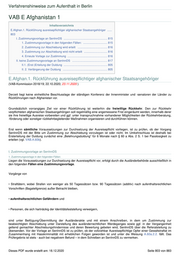 Verfahrenshinweise zum Aufenthalt in Berlin VAB E Afghanistan 1 Inhaltsverzeichnis E.Afghan.1. Rückführung ausreisepflichtiger afghanischer Staatsangehöriger ...... 803 I. Zustimmungsvorlage an SenInnDS ........................................................ 815 1. Zustimmungsvorlage in den folgenden Fällen: ............................... 815 2. Zustimmung zur Abschiebung wird erteilt ...................................... 816 3. Zustimmung zur Abschiebung wird nicht erteilt .............................. 816 4. Erneute Vorlage zur Zustimmung ................................................... 816 II. keine Zustimmungsvorlage an SenInnDS ............................................. 817 II.1. (Erst-)Erteilung der Duldung ........................................................ 805 II. 2. Verlängerung der Duldung ......................................................... 805 E.Afghan.1. Rückführung ausreisepflichtiger afghanischer Staatsangehöriger (VAB-Kommission 2018/19; 22.10.2020; 23.11.2020 ) Derzeit liegt keine einheitliche Beschlusslage der ständigen Konferenz der Innenminister und -senatoren der Länder zu Rückführungen nach Afghanistan vor. Grundsätzlich vorrangiges Ziel vor einer Rückführung ist weiterhin die freiwillige Rückkehr. Den zur Rückkehr verpflichteten afghanischen Staatsangehörigen soll regelmäßig eine angemessene Frist eingeräumt werden, innerhalb derer sie ihre freiwillige Ausreise vorbereiten und ggf. unter Inanspruchnahme vorhandener Möglichkeiten der Rückkehrberatung, -förderung oder sonstiger rückkehrbegleitender Maßnahmen organisieren und durchführen können. Erst wenn sämtliche Voraussetzungen zur Durchsetzung der Ausreisepflicht vorliegen, ist zu prüfen, ob der Vorgang SenInnDS mit der Bitte um Zustimmung zur Abschiebung vorzulegen ist oder nicht. Im Umkehrschluss ist deshalb bei Ersterteilung der Duldung zunächst eine „Belehrungsduldung“ für 6 Monate nach § 60 a Abs. 2 S. 1 bei Passlosigkeit zu erteilen (vgl. VAB.A.60b). I. Zustimmungsvorlage an SenInnDS 1. Zustimmungsvorlage in den folgenden Fällen: Liegen die Voraussetzungen zur Durchsetzung der Ausreisepflicht vor, erfolgt durch die Ausländerbehörde ausschließlich in den folgenden Fällen eine Zustimmungsvorlage. Vorgänge von • Straftätern, wobei Strafen von weniger als 50 Tagessätzen bzw. 90 Tagessätzen (additiv) nach aufenthaltsrechtlichen Vorschriften (Bagatellgrenze) außer Betracht bleiben, • aufenthaltsrechtlichen Gefährdern und • Personen, die sich hartnäckig der Identitätsfeststellung verweigern, sind unter Beifügung/Übermittlung der Ausländerakte und mit einem Anschreiben, in dem um Zustimmung zur beabsichtigten Abschiebung unter Darstellung des ausländerrechtlichen Werdeganges sowie ggf. in der Vergangenheit geltend gemachter Abschiebungshindernisse und deren Bewertung gebeten wird, SenInnDS über die Referatsleitung zu übersenden. Vor der Vorlage an SenInnDS ist zu prüfen, ob der vollziehbar Ausreisepflichtige Opfer einer Gewaltstraftat im Zusammenhang mit Hasskriminalität mit erheblichen Folgen geworden ist und unter die Weisung A.60a.2.2. fällt. Das Prüfergebnis ist stets - auch bei negativem Befund – in dem Schreiben an SenInnDS zu vermerken. Dieses PDF wurde erstellt am: 18.12.2020 Seite 803 von 883