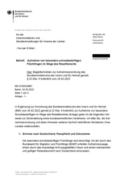 x Bundesministerium des Innern und für Heimat Bundesministerium des Innern und für Heimat, 11014 Berlin An die Alt-Moabit 140 Innenministerien und 10557 Berlin n u Postanschrift Senatsverwaltungen für Inneres der Länder 11014 Berlin - Nur per E-Mail - a www.bmi.bund.de Betreff: Aufnahme von besonders schutzbedürftigen Flüchtlingen im Wege des Resettlements Hier: Begleitschreiben zur Aufnahmeanordnung des Bundesministeriums des Innern und für Heimat gemäß $ 23 Abs. 4 AufenthG vom 24.03.2022 M3-21003/24#31 Berlin, 24.03.2022 Seite 1 von 5 Anlage: -1- In Ergänzung zur Anordnung des Bundesministeriums des Innern und für Heimat (BMI) vom 24.03.2022 gemäß $ 23 Abs. 4 AufenthG zur Aufnahme von besonders Schutzbedürftigen im Wege des Resettlements (Anlage) gebe ich die folgenden Hin- weise zur Sicherstellung eines bundeseinheitlichen Verfahrens. Ich bitte Sie, die Auf- nahmeanordnung und diese Hinweise weiteren fachlich betroffenen Ministerien Ihres Landes weiterzuleiten. 1. Einreise nach Deutschland, Passpflicht und Dokumente Die besonders schutzbedürftigen Flüchtlinge sind berechtigt, mit der durch das Bundesamt für Migration und Flüchtlinge (BAMF) erteilten Aufnahmezusage, einem durch das Auswärtige Amt ausgestellten Visum und einem anerkannten und gültigen Reisedokument nach Deutschland einzureisen. Zustell- und Lieferanschrift: Ingeborg-Drewitz-Allee 4, 10557 Berlin Verkehrsanbindung: S + U-Bahnhof Hauptbahnhof