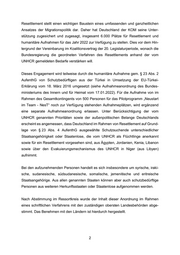 Vor diesem Hintergrund ergeht folgende Anordnung gemäß § 23 Abs. 4 AufenthG: 1. Das Bundesamt für Migration und Flüchtlinge (BAMF) erteilt bis zu 2.700 Perso- nen unterschiedlicher Staatsangehörigkeit oder Staatenlosen, die sich in Ägypten, Jordanien, Kenia, Libanon oder in Niger (ETM Niger) aufhalten und vom UNHCR im Resettlement-Verfahren als Flüchtlinge anerkannt sind, eine Aufnahmezusage. Die Personenübereinstimmung ist in jedem Verfahrens- schritt des Aufnahmeverfahrens zu gewährleisten. 2. Für die Auswahl sollen – soweit möglich – insbesondere folgende Kriterien berücksichtigt werden: a. Grad der besonderen Schutzbedürftigkeit; das gilt insbesondere für die Personen, deren Schutzbedürftigkeit von UNHCR noch nicht eingehend geprüft werden konnte; b. Wahrung der Einheit der Familie; c. Familiäre oder sonstige integrationsförderliche Bindungen nach Deutschland; d. Integrationsfähigkeit (Indikatoren beispielweise: Grad der Schul- und Berufsausbildung; Berufserfahrung; Sprachkenntnisse; geringes Alter); Auch schwerstkranke Personen können aufgenommen werden. Der Anteil schwerstkranker Personen an der Gesamtzahl der aufgenommenen Personen soll 5 % nicht überschreiten. Soweit erkennbar ist, dass es sich bei in Betracht kommenden Personen um medizinische Fälle handelt, klärt das BAMF vor der Einreise unter Berücksichtigung der jeweiligen Anzahl bereits erfolgter Aufnah- men, welches Land zur Aufnahme einer schwerstkranken Person und ihrer Familienangehörigen bereit ist. In Hinblick auf unbegleitete minderjährige Aus- länder (UMA), die im Rahmen der Resettlement-Verfahren nach Deutschland einreisen, erfolgt die Bestimmung des aufnahmepflichtigen Landes vor Einreise des UMA analog dem geltenden Verteilverfahren für UMA. 3