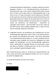 Landesaufnahmebehörde Niedersachsen, vorrangig am Standort Grenzdurch- gangslager Friedland, in der Erstaufnahmeeinrichtung Brandenburgs in Doberlug-Kirchhain oder in einer anderen Erstaufnahmeeinrichtung, die dem Bund von einem Land für diesen Zweck zur Verfügung gestellt wurde, für die Dauer von bis zu 14 Tagen durchzuführen und die Verteilung durch das BAMF auf die Länder dort vorzunehmen. Soweit eine zentrale Erstunterbringung nicht gewährleistet werden kann, erklären sich die Länder bereit, die von ihnen auf- zunehmenden Flüchtlinge unmittelbar nach deren Einreise vom Flughafen ab- zuholen und aufzunehmen. Die Direkteinreisen - insbesondere die Organisation dieser Einreisen — spricht das BAMF vorab mit den Ländern ab. Das BAMF wird die Länder rechtzeitig, spätestens aber 21 Tage vor der Ein- reise der Flüchtlinge, entsprechend informieren. 9. Ausgewählte Personen, die schwerstkrank oder minderjährig sind und ohne Familienangehörige aufgenommen werden, werden in die Verteilung einbezo- gen; Personen, die schwerstkrank sind, werden — sofern keine Unterbringung in der Erstaufnahmeeinrichtung möglich ist — von einem Vertretenden des auf- nehmenden Landes unmittelbar nach Ankunft vom Zielflughafen zum Zielort begleitet. Bei Minderjährigen, die ohne Familienangehörige aufgenommen werden, gewährleistet die zuständige Behörde des aufnehmenden Landes, dass diese am Flughafen in Empfang genommen und dem für die Inobhut- nahme zuständigen Jugendamt übergeben werden. Diese Aufnahmeanordnung ersetzt die Anordnung des Bundesministeriums des Innern, für Bau und Heimat für das Resettlement-Verfahren 2021 vom 21. Mai 2021, die hiermit ihre Gültigkeit verliert. Für das Bundesministerium des Innern und für Heimat Im Auftrag