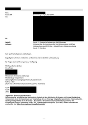 Von: E Gesendet: Donnerstag, 8. April 2021 08:47 An: Cc: Betreff: Covid-19-Testung im Rahmen von Rückführungen Anlagen: Weisung über die Anordnung der Durchführung einer ärztlichen Untersuchung nach $ 82 Abs. 4 AufenthG.docx; Musteranordnung Covid-19-Test.docx Sehr geehrte Kolleginnen und Kollegen, beigefügtes Schreiben erhalten Sie zur Kenntnis und mit der Bitte um Beachtung. Für Fragen stehe ich Ihnen gerne zur Verfügung. Mit freundlichen Grüßen Im Auftrag Ministerium für Inneres und Europa Mecklenburg-Vorpommern Abteilung Kommunalangelegenheiten; Ausländerrecht Referat Il 350 (Asyl- und Aufenthaltsrecht; Sozialleistungen für Ausländer) Telefo Telefa eMail: Allgemeine Datenschutzinformation Der telefonische, schriftliche oder elektronische Kontakt mit dem Ministerium für Inneres und Europa Mecklenburg- Vorpommern ist mit der Speicherung und Verarbeitung der von Ihnen ggf. mitgeteilten persönlichen Daten verbunden. Rechtsgrundlage hierfür ist Art. 6 Absatz 1, Buchstabe e der Datenschutzgrundverordnung (DSGVO) der Europäischen Union in Verbindung mit $ 4 Abs. 1 Landesdatenschutzgesetz (DSG-MV). Weitere Informationen erhalten Sie hier: https /Avww.regierung-mv.de/Datenschutz/
