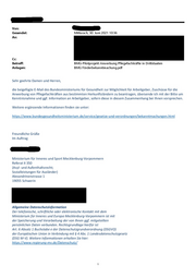 N EEE Von: Gesendet: Mittwoch, 30. Juni 2021 10:36 An: Cc: Betreff: BMG-Pilotprojekt Anwerbung Pflegefachkräfte in Drittstaaten Anlagen: BMG Förderbekanntmachung.pdf Sehr geehrte Damen und Herren, die beigefügte E-Mail des Bundesministeriums für Gesundheit zur Möglichkeit für Arbeitgeber, Zuschüsse für die Anwerbung von Pflegefachkräften aus bestimmten Herkunftsländern zu beantragen, übersende ich mit der Bitte um Kenntnisnahme und ggf. Information an Arbeitgeber, sofern diese in diesem Zusammenhang bei Ihnen vorsprechen. Weitere ergänzende Informationen finden sie unter: www.bundesgesundheitsministerium.de/service/gesetze-und-verordnungen/bekanntmachungen.html Freundliche Grüße Im Auftrag Ministerium für Inneres und Sport Mecklenburg-Vorpommern Referat II 350 (Asyl- und Aufenthaltsrecht; Sozialleistungen für Ausländer) Alexandrinenstrasse 1 19055 Schwerin Allgemeine Datenschutzinformation Der telefonische, schriftliche oder elektronische Kontakt mit dem Ministerium für Inneres und Europa Mecklenburg-Vorpommern ist mit der Speicherung und Verarbeitung der von Ihnen ggf. mitgeteilten persönlichen Daten verbunden. Rechtsgrundlage hierfür ist Art. 6 Absatz 1 Buchstabe e der Datenschutzgrundverordnung (DSGVO) der Europäischen Union in Verbindung mit $ 4 Abs. 1 Landesdatenschutzgesetz (DSG M-V). Weitere Informationen erhalten Sie hier: https://www.regierung-mv.de/Datenschutz