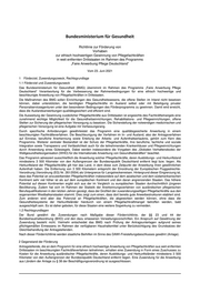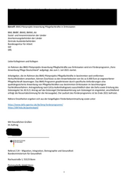 Betreff: BMG-Pilotprojekt Anwerbung Pflegefachkräfte in Drittstaaten BMI, BMBF, BMAS, BMWI, AA Sozial- und Innenministerien der Länder Anerkennungsbehörden der Länder Zentrale Ausländerbehörden Bundesagentur für Arbeit GIZ GfG Liebe Kolleginnen und Kollegen im Rahmen des BMG Pilotprojekts Anwerbung Pflegfachkräfte aus Drittstaaten wird ein Förderprogramm „Faire Anwerbung Pflege Deutschland“ aufgelegt, das zum 1. Juli 2021 startet. Arbeitgeber, die im Rahmen des BMG-Pilotprojekts Pflegefachkräfte in bestimmten weit entfernten Herkunftsländern anwerben, können Zuschüsse zu den Anwerbekosten von bis zu 6.000 Euro je angeworbener Pflegefachkraft beantragen. Das BMG-Programm gewährleistet durch spezifische Anforderungen eine qualitätsgesicherte Anwerbung von Pflegefachkräften aus bestimmten Drittstaaten im beschleunigten Fachkräfteverfahren: Antragstellung nach $ 81a Aufenthaltsgesetz ausschließlich über die DeFa sowie Erteilung des Gütesiegels/ bis 30.9.21 Antrag auf das Gütesiegel (Verbändeanhörung zum Gütesiegel ist eingeleitet, anschließend erfolgt die Ressortabstimmung für die Herausgabe). Die Laufzeit des Förderprogramms ist bis Ende 2021 befristet. Nähere Einzelheiten ergeben sich aus der beigefügten Förderbekanntmachung sowie unter https://www.defa-agentur.de/de/bmg-forderprogramm https://dkf-kda.de/guetesiegel Mit freundlichen Grüßen Im Auftrag # Buandesminiztorium . für Gesemdhait Referat Z 24 - Migration, Integration, Demographie und Gesundheit Bundesministerium für Gesundheit Rochusstraße 1, 53123 Bonn u u Bonn