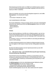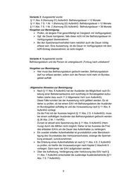Variante 3: Ausgewertet wurde: § 11 Abs. 6 (Kennung 01) AufenthG: Befristungsdauer > 12 Monate § 11 Abs. 7 S. 1 Nr. 1 (Kennung 02) AufenthG: Befristungsdauer > 12 Monate § 11 Abs. 7 S. 1 Nr. 2 (Kennung 03) AufenthG: Befristungsdauer > 36 Monate Vorgehen zur Bereinigung: Prüfen, ob längere Frist gerechtfertigt ist (Vergleich mit Verfügungstext) Ggf. die Dauer korrigieren, falls diese nicht mit der Befristungsdauer im Verfügungstext übereinstimmt Bei den Speichersachverhalten kann natürlich auch die Dauer richtig erfasst sein. Eine Auswertung, ob die Dauer im Verfügungstext mit dem AZR-Eintrag übereinstimmt, ist nicht möglich Variante 4: Ausgewertet wurde: Befristungsdatum und die Person ist untergetaucht „Fortzug nach unbekannt“ Vorgehen zur Bereinigung: Hier muss das Befristungsdatum gelöscht werden, Befristungsdatum darf nur erfasst werden, sofern sich die Person nicht mehr im Bundes- gebiet aufhält Allgemeine Hinweise zur Bereinigung: Nach § 11 Abs. 8 AufenthG hat der Ausländer die Möglichkeit nach Er- teilung einer Betretenserlaubnis sich kurzfristig im Bundesgebiet aufzu- halten (siehe dazu auch 11.2 Allgemeine VwV zum AufenthG). Diese Fälle konnten bei der Auswertung nicht gefiltert werden. Es ist daher zu prüfen, ob bei einem EAV mit Befristungsdatum der Ausländer im Bundesgebiet aufhältig ist und die Voraussetzung nach § 11 Abs. 8 AufenthG vorliegt. Da die Frist mit der Ausreise beginnt (§ 11 Abs, 2 S. 4 AufenthG), muss bei einem aufhältigen Ausländer das Befristungsdatum gelöscht werden (§ 36 Abs. 2 Nr. 1 VwVfG). Zurzeit ist aktuell eine Speicherung des § 11 Abs. 9 AufenthG (Hem- mung) durch die ABHen nicht möglich. Daher ist bei Ausreise die Frist des erfassten EAVs um die Dauer des Aufenthaltes zu verlängern. Ein zuwider erteilter Aufenthaltstitel ist grundsätzlich unter Berücksich- tigung des Grundsatzes des Vertrauensschutzes, solange die Sperrwir- kung andauert, zurückzunehmen. Bei Erteilung eines Aufenthaltstitels ist nach § 11 Abs. 4 S. 2 AufenthG zu prüfen, ob hierfür die Voraussetzungen nach Kapitel 2 Abschnitt 5 vorliegen. Dann kann der EAV aufgehoben werden. Über die Aufhebung, Verlängerung oder Verkürzung des EAV nach § 11 Abs. 7 AufenthG entscheidet die zuständige Ausländerbehörde (§11 Abs. 7 S. 7 AufenthG). 5