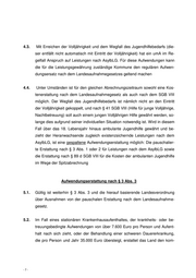 4.3. Mit Erreichen der Volljährigkeit und dem Wegfall des Jugendhilfebedarfs (die- ser entfällt nicht automatisch mit Eintritt der Volljährigkeit) hat ein umA im Re- gelfall Anspruch auf Leistungen nach AsylbLG. Für diese Aufwendungen kann die für die Leistungsgewährung zuständige Kommune den regulären Aufwen- dungsersatz nach dem Landesaufnahmegesetzes geltend machen 4.4. Unter Umständen ist für den gleichen Abrechnungszeitraum sowohl eine Kos- tenerstattung nach dem Landesaufnahmegesetz als auch nach dem SGB VIII möglich. Der Wegfall des Jugendhilfebedarfs ist nämlich nicht an den Eintritt der Volljährigkeit gekoppelt, und nach § 41 SGB VIII (Hilfe für junge Volljährige, Nachtbetreuung) soll auch einem jungen Volljährigen Hilfe gewährt werden, so- lange dies aufgrund seiner individuellen Situation notwendig ist. Wird in diesem Fall über das 18. Lebensjahr hinaus ambulante Jugendhilfe gewährt und be- zieht der Heranwachsende zugleich existenzsichernde Leistungen nach dem AsylbLG, ist eine gespaltene Aufwendungserstattung möglich: Die pauschalier- te Erstattung nach § 3 Abs. 1 oder 2 für Leistungen nach dem AsylbLG sowie die Erstattung nach § 89 d SGB VIII für die Kosten der ambulanten Jugendhilfe im Wege der Spitzabrechnung Aufwendungserstattung nach § 3 Abs. 3 5.1. Gültig ist weiterhin § 3 Abs. 3 und die hierauf basierende Landesverordnung über Ausnahmen von der pauschalen Erstattung nach dem Landesaufnahme- gesetz. 5.2. Im Fall eines stationären Krankenhausaufenthaltes, der krankheits- oder be- treuungsbedingte Aufwendungen von über 7.600 Euro pro Person und Aufent- halt nach sich zieht, oder der Behandlung einer schweren Dauererkrankung, die pro Person und Jahr 35.000 Euro übersteigt, erstattet das Land den kom- -7-