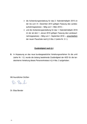 die Aufwendungserstattung für das 2. Kalenderhalbjahr 2015 (in der bis zum 31. Dezember 2015 gültigen Fassung des Landes- aufnahmegesetzes) – fällig zum 1. März 2016 – und die Aufwendungserstattung für das 1. Kalenderhalbjahr 2016 (in der ab dem 1. Januar 2016 gültigen Fassung des Landesauf- nahmegesetzes) – fällig zum 1. September 2016 –, einschließlich der neuen Pauschale nach § 3 Abs. 2 (siehe Nr. 3.1.). Zuständigkeit nach § 4 8. In Anpassung an das neue bundesgesetzliche Verteilungsverfahren für die umA (siehe Nr. 1.2.) wurde die bislang bestehende Zuständigkeit der ADD für die lan- desinterne Verteilung dieses Personenkreises in § 4 Abs. 2 aufgehoben. Mit freundlichen Grüßen Dr. Elias Bender -9-