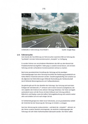 [13] ~. ~ ,. ' 9: C-9• - -~ IJ Unfallstelle in Fahrtrichtung Tesla Model S Quelle: Google Maps 1.4. Fahrversuche Zum Zwecke der Durchführung von Fahrversuchen stand dem KBA ein Fahrzeug des Typ Model S mit dem Fahrerassistenzsystem „ Autopilot" zu r Verfügung. Es wurden Fahrten von verschiedenen Mitarbeitern des KBA aus dem Bereich der Produktsicherheit durchgeführt. Dabei ging es zunächst einmal darum, sich mit dem Fahrzeug und den vorhandenen Assistenzsystemen vertraut zu machen . Nach einer grundsätzlichen Einstellung des Fahrzeugs auf die jeweiligen Fahrerbedingungen kann dem Fahrzeug hinsichtlich der Bedienung grundsätzlich ein hohes Maß an lntu itivität attestiert we rden . Gewöhnungsbedürftig sind zunächst nur die allgemein bei Elektrofahrzeugen fehlende Rückmeldung der Fahrbereitschaft durch fehlende Motorengeräusche und Aufbauvibrationen . Das gleiche gilt auch für das Abstellen des Fahrzeugs. Das Fahrzeug wird nach dem Einlegen der Getriebestufe „ P" verlassen und in einem Zustand zurückgelassen, der rein subjektiv den Eindruck eines aktiven Fahrzeugs hinterlässt. Die Türen verriegeln automatisch wenn sich die Person mit dem Schlüssel vom Fahrzeug entfernt. Bildschirm und Displays sowie die äußere Fahrzeugbeleuchtung sind zunächst weiter aktiv und schalten sich erst nach einiger Zeit ab. Im Fahrbetrieb genügt eine relativ kurze Fahrstrecke, um ein grundsätzliches Gefühl der Sicherheit bei der Steuerung des Fahrzeugs im Verkehr zu erlangen . Nach der Aktivierung des Lenkassistenten - und damit der „Autopilot" - aktiviert, ist das Fahren zunächst deutlich anstrengender, da sämtliche Lenkbewegungen des Fahrzeugs mit sehr hoher Aufmerksamkeit überwacht werden . Die Fahrer saßen
