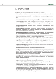 8 DQR-GloSSAR III. DQR-Glossar Im Folgenden wird die Verwendung zentraler Begriffe im DQR erläutert. Die Anforderungsstruktur eines Y Lern- oder Arbeitsbereichs beinhaltet die entscheidenden Hinweise auf die Niveauzuordnung einer Y Qualifikation. Sie wird durch die Merkmale Komplexität, Dynamik, erforderliche Y Selbständigkeit und Innovationsfähigkeit beschrie ben. Ein Arbeitsbereich ist ein Feld praktischer Anwendung von Y Kompetenzen, das durch eine charakteristische Y Anforderungsstruktur gekennzeichnet ist. Aufgabe, Erfüllung einer, ist die Herbeiführung eines definierten erwünschten Zielzu stands mithilfe bekannter vorgegebener Methoden. Sie grenzt sich von der Lösung eines Y Problems ab. Berufliches Tätigkeitsfeld bezeichnet einen Y Arbeitsbereich, in dem Menschen ihrem Erwerb nachgehen. Berufliches Wissen verbindet die Kenntnis von Fakten, Grundsätzen und Theorien mit Praxiswissen, insbesondere dem Wissen um Verfahrens- und Vorgehensmöglichkeiten, in einem arbeitsmarktrelevanten Tätigkeitsfeld. Beurteilungsfähigkeit ist die Fähigkeit, Lern- oder Arbeitsprozesse und ihre Ergebnisse mit relevanten Maßstäben zu vergleichen und auf dieser Grundlage zu bewerten. Breite bezieht sich auf die Anzahl von Bereichen des allgemeinen, beruflichen oder wissen schaftlichen Wissens, die mit einer Y Qualifikation verbunden sind. Eigenständigkeit bezeichnet die Fähigkeit und das Bestreben, in unterschiedlichen Situati onen angemessene Entscheidungen zu treffen und ohne fremde Hilfe zu handeln. Fachkompetenz umfasst Y Wissen und Y Fertigkeiten. Sie ist die Fähigkeit und Bereit schaft, Aufgaben- und Problemstellungen eigenständig, fachlich angemessen, methoden geleitet zu bearbeiten und das Ergebnis zu beurteilen. Fachtheoretisches Wissen bezeichnet Y Fachwissen, zu dem die Kenntnis der bedeutends ten Theorien eines Fachs gehört. Fachwissen bezeichnet Fakten-, Regel- und/oder Begründungswissen. Fertigkeiten bezeichnen die Fähigkeit, Y Wissen anzuwenden und Know-how einzusetzen, um Aufgaben auszuführen und Probleme zu lösen. Wie im Europäischen Qualifikations rahmen werden Fertigkeiten als kognitive Fertigkeiten (logisches, intuitives und kreatives Denken) und als praktische Fertigkeiten (Geschicklichkeit und Verwendung von Methoden, Materialien, Werkzeugen und Instrumenten) beschrieben. Führungsfähigkeit bezeichnet die Fähigkeit, in einer Gruppe oder einer Organisation auf zielführende und konstruktive Weise steuernd und richtungsweisend auf das Verhalten anderer Menschen einzuwirken. Unter Innovation wird die praktische Umsetzung von Ideen in neue Produkte, Dienstleis tungen, Prozesse, Systeme und soziale Interaktionen verstanden. Instrumentale Fertigkeiten sind Fertigkeiten der Anwendung, sei es von Ideen, Theorien, Methoden oder Hilfsmitteln, Technologien und Geräten. Kommunikation bezeichnet den verständigungsorientierten Austausch von Informatio nen zwischen Personen, in Gruppen und Organisationen. Kompetenz bezeichnet im DQR die Fähigkeit und Bereitschaft des Einzelnen, Kenntnisse und Y Fertigkeiten sowie persönliche, soziale und methodische Fähigkeiten zu nutzen und sich durchdacht sowie individuell und sozial verantwortlich zu verhalten. Kompetenz wird in diesem Sinne als umfassende Handlungskompetenz verstanden.