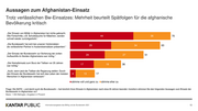 Aussagen zum Afghanistan-Einsatz Trotz verlässlichen Bw-Einsatzes: Mehrheit beurteilt Spätfolgen für die afghanische Bevölkerung kritisch „Der Einsatz von Militär in Afghanistan hat nichts gebracht. Alle Fortschritte, z.B. Schulbesuche für Mädchen, werden 44 26 70 schnell wieder zurückgedreht.“ „Die Bundeswehr hat sich bei unseren Verbündeten 29 34 63 als verlässlicher Partner in Auslandseinsätzen präsentiert.“ „Der Einsatz der Bundeswehr zur Sicherung der zivilen 24 27 51 Aufbauhilfe im Norden Afghanistans war richtig.“ „Der Kampfeinsatz zum Sturz der Taliban vor 20 Jahren 17 19 36 war richtig.“ „Auch, wenn jetzt die Taliban die Regierung stellen: Durch den Einsatz der Bundeswehr hat sich das Leben der meisten 4 13 17 Menschen in Afghanistan verbessert.“ stimme voll und ganz zu stimme eher zu Frage: Die NATO – und damit auch die Bundeswehr – hat kürzlich ihren Einsatz in Afghanistan nach etwa 20 Jahren beendet. Inwiefern stimmen Sie den folgenden Aussagen zum Einsatz der Bundeswehr in Afghanistan zu? Basis: 1.504 Befragte | Angaben in Prozent Informationsangebote des BMVg und der Bundeswehr 2021 13