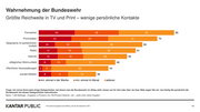 Wahrnehmung der Bundeswehr | Bewertung im Trend Persönliche Erlebnisse bleiben überwiegend positiv – gemischtes Bild im Netz 70 Sehr oder eher positive Wahrnehmung 61 öffentliche Veranstaltungen 60 59 alltägliches Wohnumfeld 50 Gespräche im persönlichen Umfeld 45 47 43 Fernsehen 42 42 40 39 Radio 38 37 38 Printmedien 31 31 30 29 Internet allgemein 28 soziale Medien 20 10 2012 2013 2014 2015 2016 2017 2018 2019 2020* 2021 Frage: Sagen Sie mir bitte, wie Sie die Bundeswehr bei diesen Gelegenheiten/in diesen Sendungen bzw. Beiträgen wahrnehmen. Basis: Je nach Kanal mindestens 516 Befragte (2021), die die Bundeswehr auf diese Weise wahrgenommen haben | Darstellung: Anteilssumme „sehr / eher positive“ Wahrnehmung in Prozent | *) Abweichende Befragungsmethode: CATI-Befragung Informationsangebote des BMVg und der Bundeswehr 2021 20