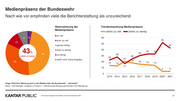 Medienpräsenz der Bundeswehr Nach wie vor empfinden viele die Berichterstattung als unzureichend Wahrnehmung der Trendentwicklung Medienpräsenz Medienpräsenz (eher) zu viel (eher) zu wenig zu viel 8 12 60 eher zu viel 52 10 50 genau richtig 43 43% 46 eher zu wenig zu wenig 40 30 28 30 33 33 (eher) zu wenig 25 23 weiß nicht, keine Angabe 21 18 33 20 16 15 14 13 14 17 10 4 4 0 2013 2014 2015 2016 2017 2018 2019 2020* 2021 Frage: Wird Ihrer Meinung nach in den Medien über die Bundeswehr ... berichtet? Basis: 1.504 Befragte | Angaben in Prozent | *) Abweichende Befragungsmethode: CATI-Befragung Informationsangebote des BMVg und der Bundeswehr 2021 21