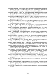 Herrmann, Richard K. (2003): Image Theory and Strategic Interaction in International Relations. In: Huddy, Leonie/Sears, David O./Jervis, Robert (Hrsg.): Oxford Hand- book of Political Psychology. Oxford: Oxford University Press, 285–314. Herrmann, Richard K. (1986): The Power of Perceptions in Foreign-Policy Decision Making: Do Views of the Soviet Union Determine the Policy Choices of American Leaders? In: American Journal of Political Science 30:4, 841–875. Herrmann, Richard K./Fischerkeller, Michael P. (1995): Beyond the Enemy Image and Spiral Model: Cognitive-Strategic Research after the Cold War. In: International Or- ganization 49: 3, 415–450. Herrmann, Richard K./Voss, James F./Schooler, Tonya Y.E./Ciarocchi, Joseph (1997): Images in International Relations: An Experimental Test of Cognitive Schemata. In: International Studies Quarterly 41: 3, 403–433. Holsti, Ole R. (1992): Public Opinion and Foreign Policy: Challenges to the Almond- Lippmann Consensus. In: International Studies Quarterly 36: 4, 439–466. Huddy, Leonie/Feldman, Stanley/Capelos, Theresa/Provost, Colin (2002): The Conse- quences of Terrorism: Disentangling the Effects of Personal and National Threat. In: Political Psychology 23: 3, 485–509. Huddy, Leonie/Feldman, Stanley/Taber, Charles/Lahav, Gallya (2005): Threat, Anxiety, and Support of Antiterrorism Policies. In: American Journal of Political Science 49: 3, 593–608. Hummelsheim-Doss, Dina (2017): Objektive und subjektive Sicherheit in Deutschland. Eine wissenschaftliche Annäherung an das Sicherheitsgefühl. In: Aus Politik und Zeitgeschichte 67: 32–33, 34–39. Hunter, Lance Y./Robbins, Joseph W. (2016): Military Spending and Electoral Systems: A Reconsideration. In: Armed Forces & Society 42: 1, 51–74. Hurwitz, Jonathon M./Peffley, Mark A. (1987): How Are Foreign Policy Attitudes Struc- tured? A Hierarchical Model. In: American Political Science Review 81, 1099–1119. Hurwitz, Jonathon M./Peffley, Mark A./Seligson, Mitchell A. (1993): Foreign Policy Be- lief Systems in Comparative Perspective: The United States and Costa Rica. In: In- ternational Studies Quarterly 37, 245–270. IfD Allensbach (2020): Das Streben nach Sicherheit als Gefahr für die Freiheit. Eine Dokumentation des Beitrags von Dr. Thomas Petersen in der Frankfurter Allgemei- nen Zeitung Nr. 96 vom 24. April 2020 <https://www.ifd-allensbach.de/fileadmin/ kurzberichte_dokumentationen/FAZ_April2020_Sicherheit.pdf> [21.9.2020]. Infratest dimap (2016): ARD-DeutschlandTREND Januar 2016. Eine Studie im Auftrag der tagesthemen <https://www.tagesschau.de/inland/deutschlandtrend-469.pdf> [2.7.2019]. Inglehart, Ronald F. (1990): Culture Shift in Advanced Industrial Society. Princeton, NJ: Princeton University Press. Inglehart, Ronald F./Puranen, Bi/Welzel, Christian (2015): Declining willingness to fight for one’s country: The individual-level basis of the long peace. In: Journal of Peace Research 52: 4, 418–434. IP-Forsa (2013): IP-Forsa-Frage. Einsatz bewaffneter Drohnen? In: Internationale Politik 68: 3, 4. 278